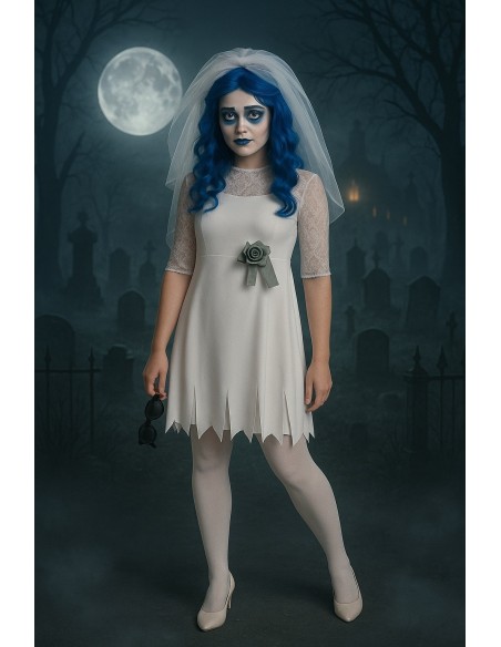 Dress made of semi-elastic machine-knit fabric and soft lace, with lace-style detailing on the chest and sleeves. The closure is located at the back with a tie around the neck. The outfit is complemented by a belt made of fabric, resembling a withered flower, and a hair accessory in the form of a headband adorned with small flowers and tatters that evoke the characteristic veil of a corpse bride.
