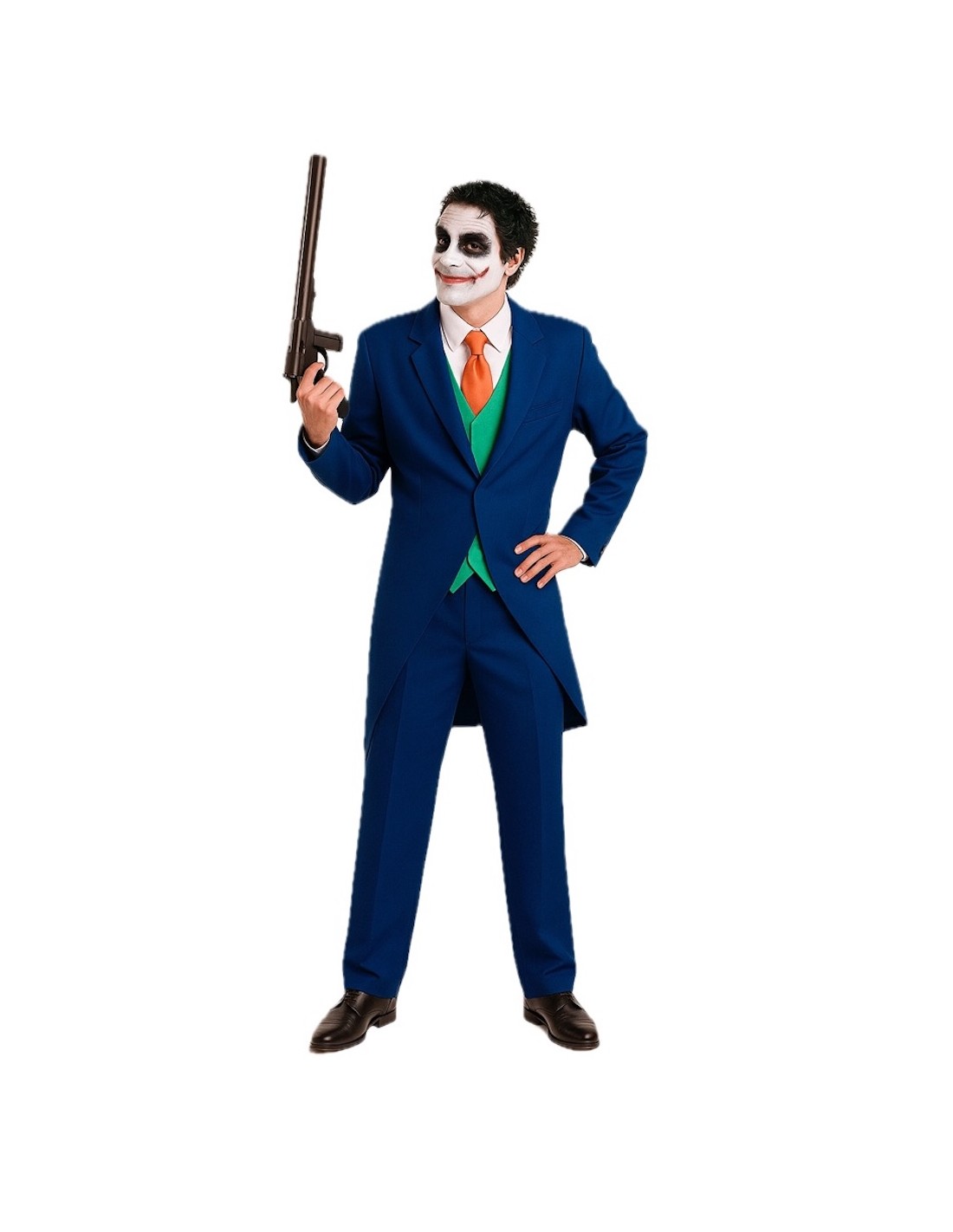 This classic villain costume, made of thick and soft polyester, consists of a tailcoat jacket with a velcro closure, a fake vest, and pants with an elastic waistband and an interior pocket. It is completed with a satin tie attached to TNT fabric.