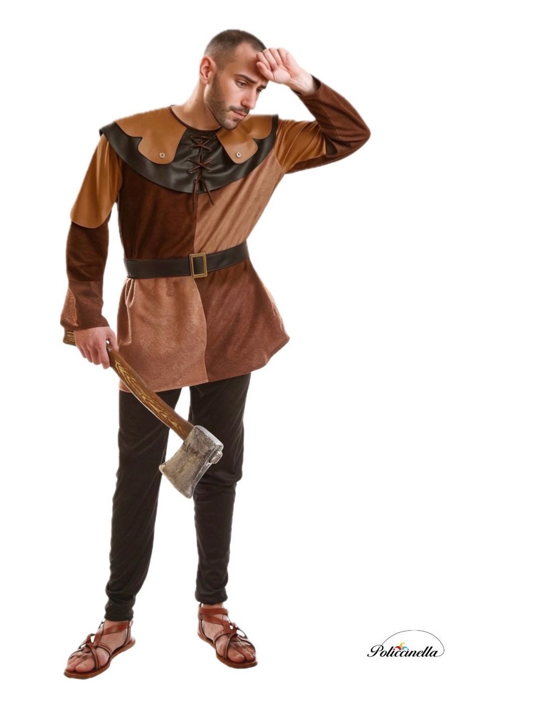 This classic medieval costume consists of three pieces: a long JACKET made of polyester, with a peach-like texture, featuring a black/brown faux leather collar, decorated with two pieces that simulate bronze, laces, and a back closure with a velcro system. The PANTS are made of machine-knit fabric, with an elastic waistband and a small interior pocket, and finally, a BELT made of polyester covering a piece of TNT for greater rigidity and structure. The belt has a rigid plastic gold buckle that simulates metal.