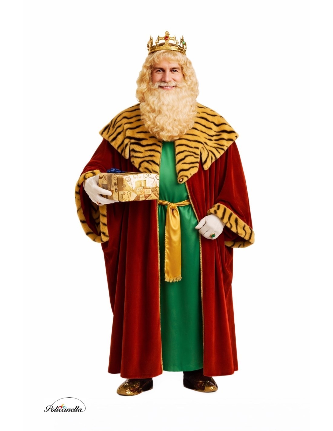 This majestic outfit is composed of a long thick velvet cape, with a collar and cuffs that simulate tiger skin. It is all adorned with an elegant golden trim that extends throughout the garment. Under the cape, there is a long tunic or jacket, with long sleeves, closed at the neck with Velcro at the back, made of a soft bottle green satin. And finally, a golden sash with fringes, which is adjusted with a bow, completes the outfit.