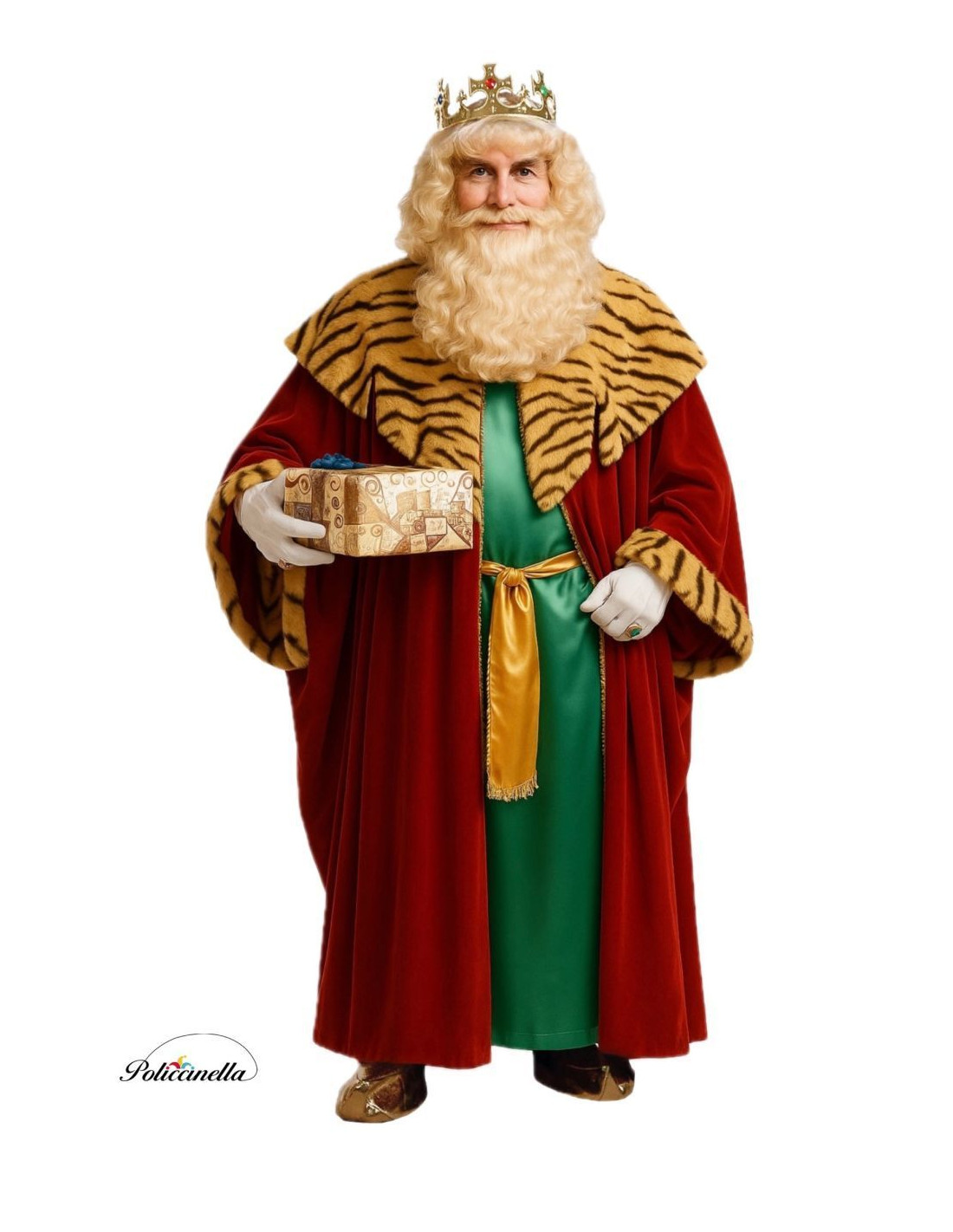 This majestic outfit is composed of a long cloak made of thick velvet, with a collar and cuffs that simulate tiger skin. It is all adorned with an elegant golden trim that extends throughout the garment. Under the cloak, there is a long tunic or jacket, with long sleeves, closed at the neck with Velcro at the back, made of a soft bottle green satin. Finally, a golden sash with fringes, fastened with a bow, completes the outfit.