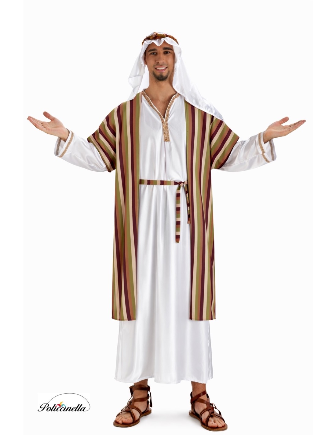 This costume is composed of a tunic made of soft polyester adorned with a ribbon sewn to the tunic at both the neck and sleeves. It is accompanied by a long vest made of a soft but structured polyester with side openings on the legs for better mobility, and a veil made of the same fabric as the tunic. It also includes a braided cord made of the same fabric as the vest to hold the veil in place. The ensemble is completed with a waist sash made of the same material as the vest and cord.