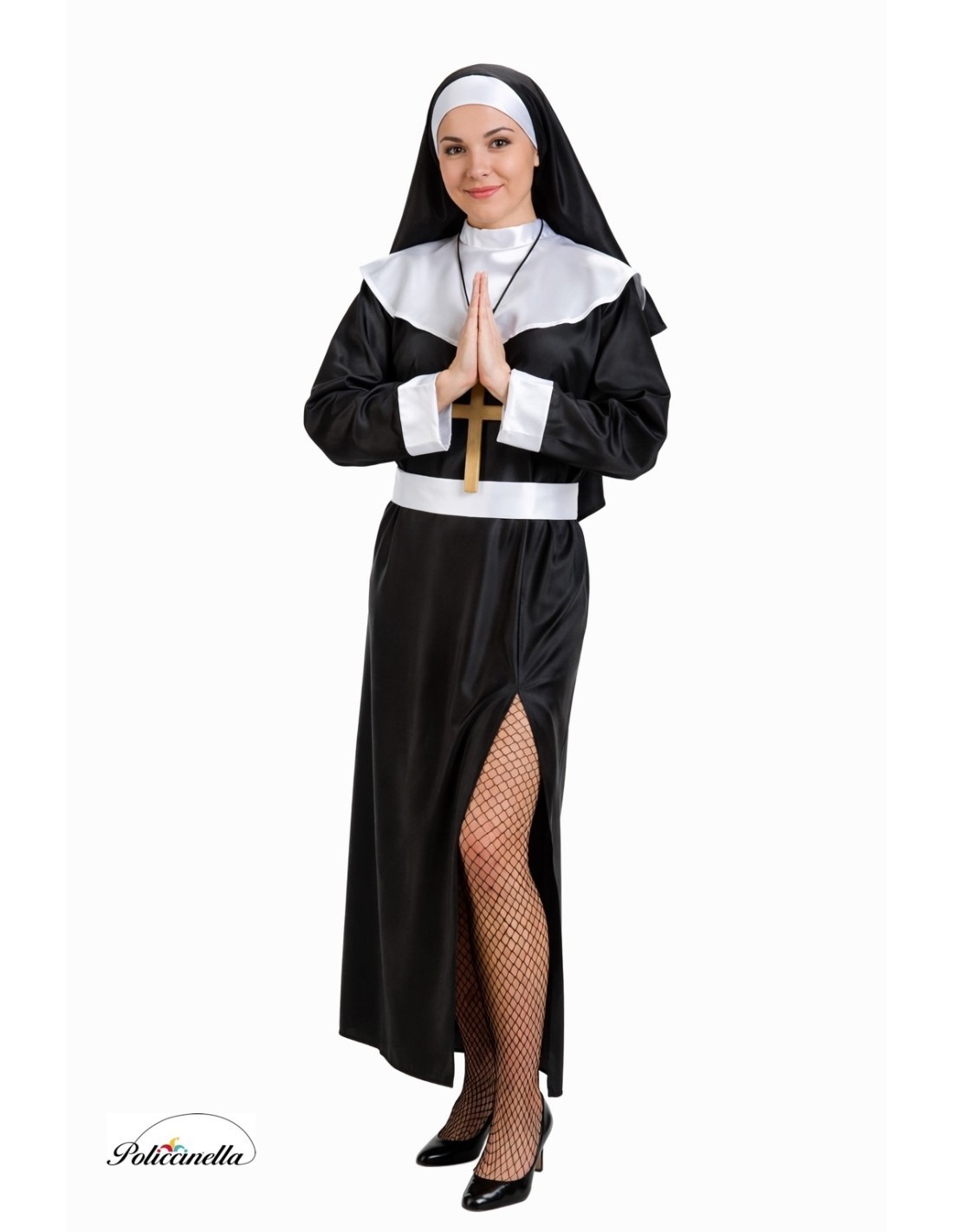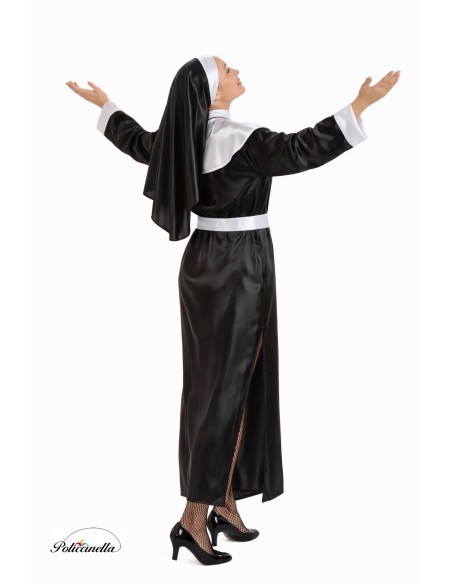 This nun costume consists of a long tunic or hooded robe with a closure at the back of the neck secured by a tie. It includes a white bib or headscarf with a velcro closure at the back of the neck, a belt for better adaptability to the outfit, also with a velcro closure at the back, and the characteristic coif or headpiece, which is adjusted at the back with a small clasp. The entire ensemble is made of a soft and thick satin fabric that is not see-through.