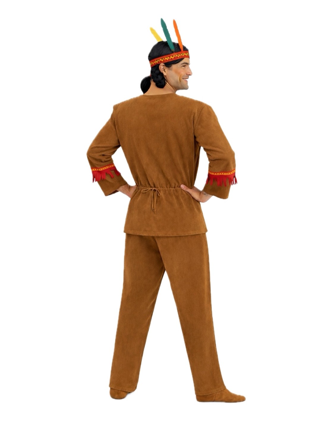 This costume, made of a soft fabric similar to velvet, emulates the characteristic attire of Native Americans from the West, who used animal skins from hunting for its creation. The jacket closes with Velcro at the back of the neck. On top of it, a chest piece with an animal print pattern has been made, adorned with fringes and printed ribbon, the same one used for the headpiece, which is secured with an elastic band. The pants, with an elastic waistband and internal pocket, feature the same decoration at the ankles as the chest. The outfit is completed with an apron that harmonizes with the rest of the costume in terms of tones, fabric, and details, and is tied at the waist.