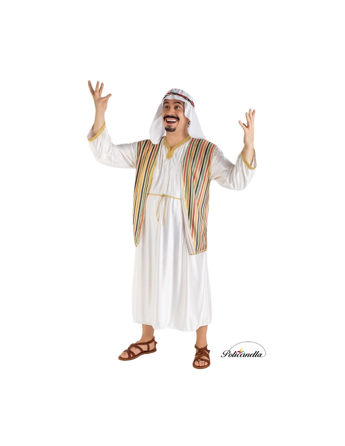 This costume is composed of a tunic made of soft satin adorned with gold braid on both the collar and sleeves, which is sewn onto the tunic. It is accompanied by a long vest also made of satin, a veil made of the same fabric, and braided cord to hold the veil in place. The ensemble is completed with a bow at the waist made of the same braid, harmonizing with the outfit.