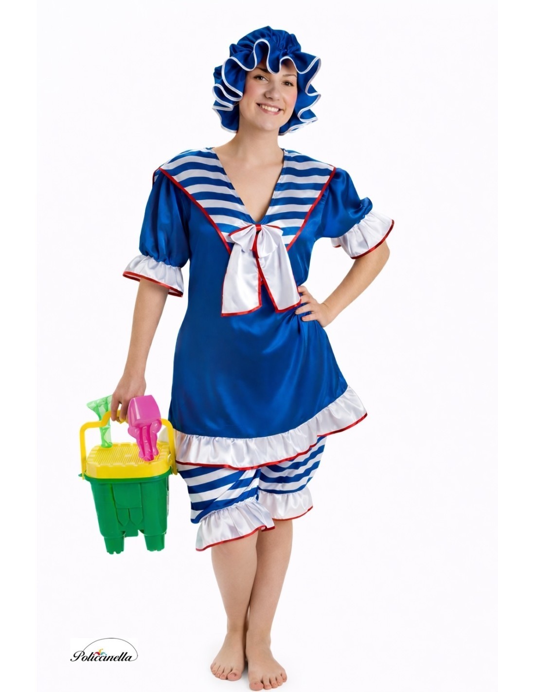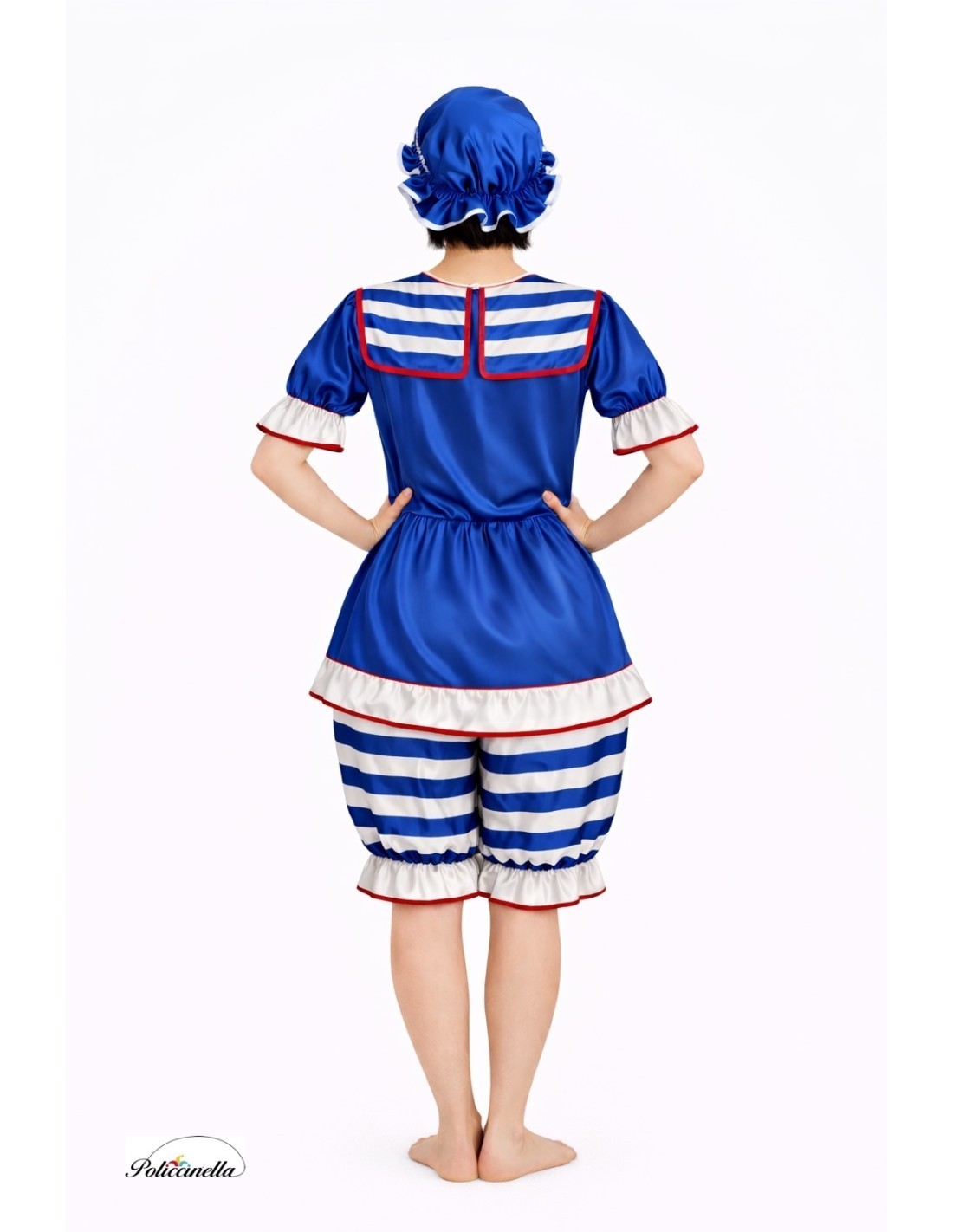 A retro design with great charm that recreates the beach style of the 1920s. Made of dense electric blue satin, it combines comfort and visual appeal. The top is a long t-shirt with a velcro closure at the neck and elastic at the waist that adds a slight flow to the silhouette. It includes a sailor collar with a decorative bow and short puffy sleeves with elastic cuffs. The shorts, also in satin, feature an elastic waist, elastic cuffs, and an inner pocket. The entire set is adorned with a red trim that highlights its design. It is completed with the characteristic shower cap, gathered and trimmed, in electric blue with a cute red bow at the front. An original, well-made costume full of details to stand out at any party.