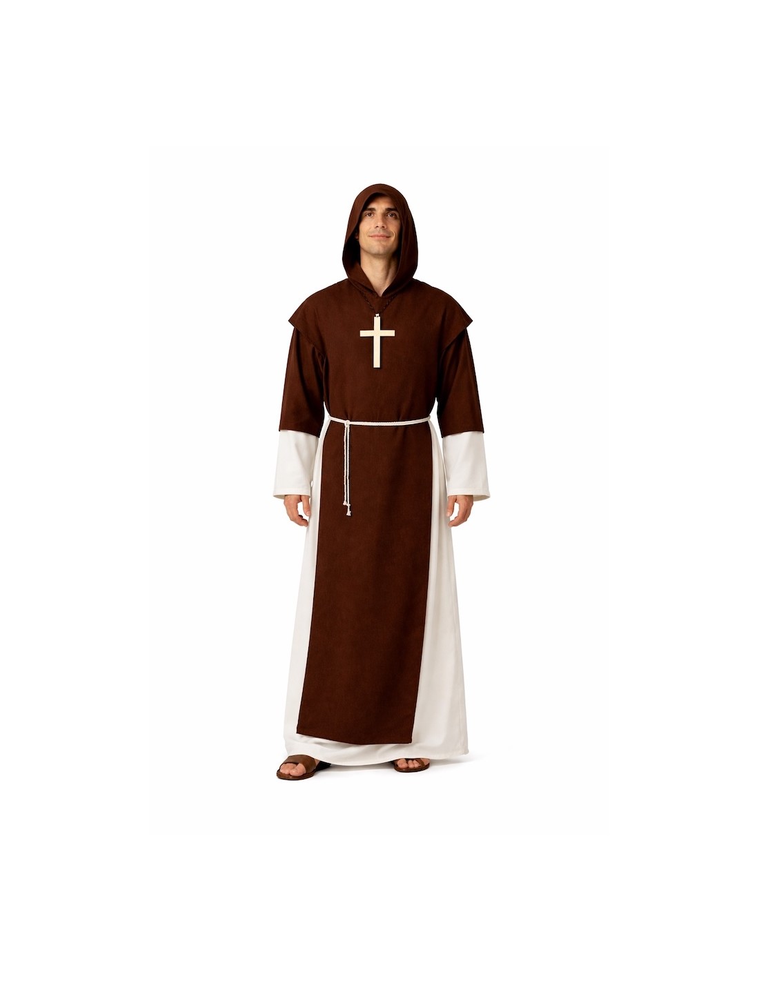 Medieval monk habit made of dense polyester, with a long and straight cut, with a tie at the neck in the back for adjustment. Includes integrated scapular and hood, made of peach-like polyester fabric, providing texture and visual contrast. The set is completed with a functional cord at the waist to adjust and reinforce the traditional silhouette of the monastic habit.