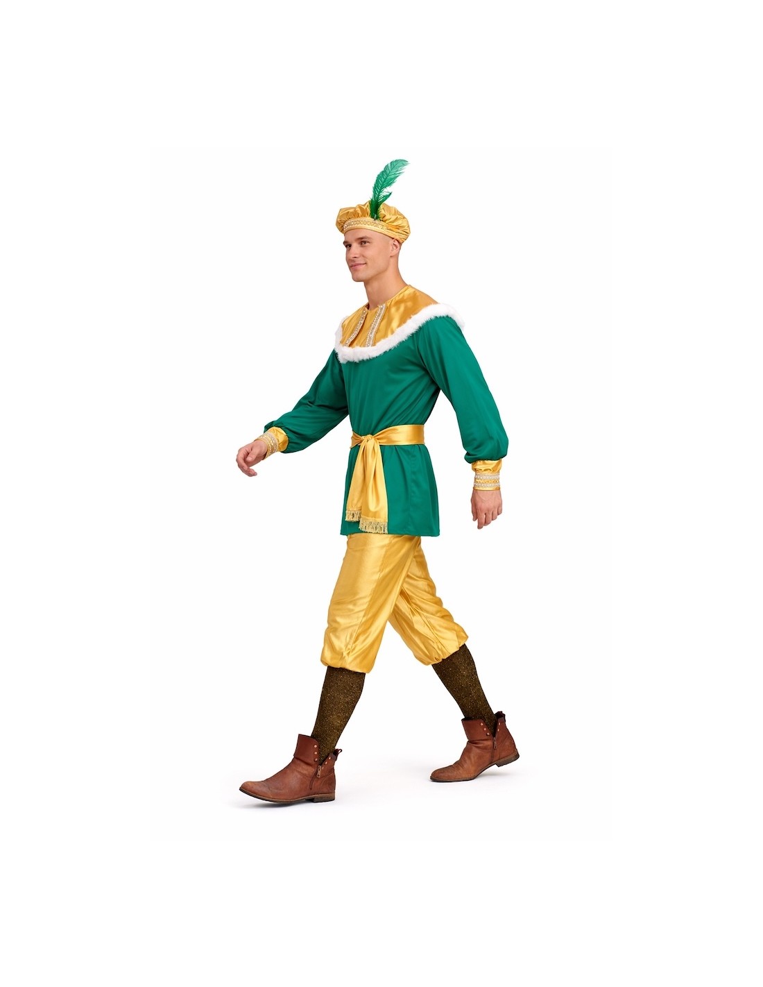 Includes a soft satin jacket with velcro closure and velvet collar, adorned with a feather boa and delicate trim on the collar and cuffs. The pants, also made of satin, have elastic at the waist and legs for added comfort. Completing the outfit is a beautiful sash with fringes and a cap decorated with feathers and matching trim. Both items are made of the same fabric as the rest of the costume. A colorful, comfortable outfit full of details to look like a real page boy.