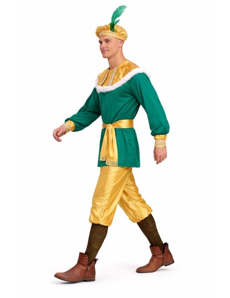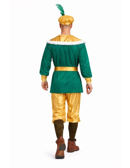 Includes a soft satin jacket with Velcro closure and velvet collar, adorned with a boa and delicate trim on the collar and cuffs. The pants, also made of satin, have elastic at the waist and legs for greater comfort. Completing the ensemble is a beautiful sash with fringes and a cap decorated with a feather and matching trim. Both made from the same fabric as the rest of the costume. A showy, comfortable outfit full of details to look like a real page.