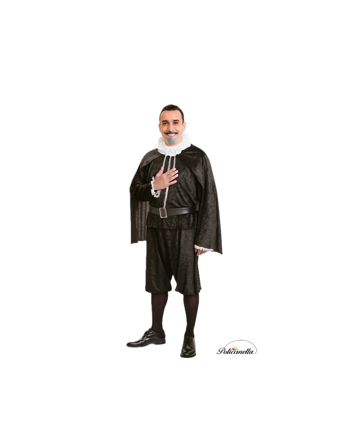 An elegant and majestic period costume, made of ultra-soft velvet that combines comfort and distinction. The shirt, with a Velcro closure at the neck, features cuffs with delicate lace trim and a chest decorated with braided silver braid. The back, in a semi-elastic fabric, includes elastic at the hem for a perfect fit. The pants, also made of velvet, have an elastic waist, an interior pocket, and elastic at the hem for an authentic "puffy" effect. Includes a ruffled satin collar to simulate an undershirt, a velvet cape with an elegant drape, and a black satin belt with a silver metal-effect buckle. A versatile and well-crafted costume, ideal for portraying Cervantes or embodying a cheerful troubadour.