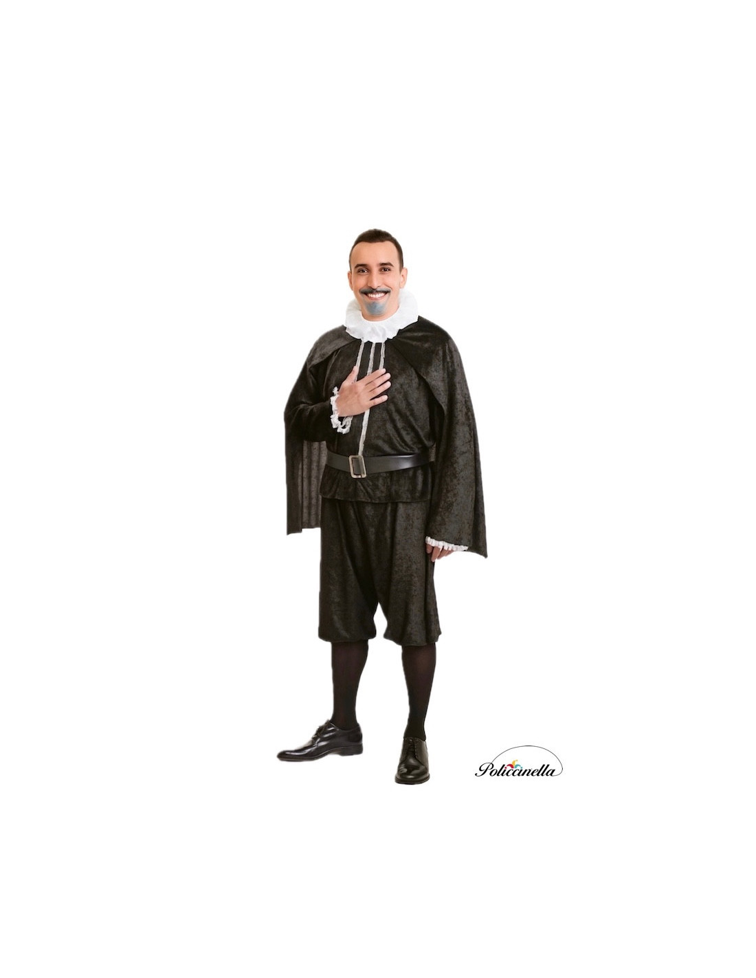 An elegant and majestic period costume, made of ultra-soft velvet that combines comfort and distinction. The shirt, with a velcro closure at the neck, features cuffs with fine lace trim and a chest decorated with braided silver trim. The back, in semi-elastic fabric, includes elastic at the bottom for a perfect fit. The pants, also in velvet, have an elastic waist, an interior pocket, and elastic at the bottom for an authentic "puffy" effect. It includes a ruffled satin collar that simulates an inner shirt, a velvet cape with an elegant drape, and a black satin belt with a silver buckle for a metallic effect. A versatile and well-crafted costume, ideal for portraying Cervantes or embodying a cheerful troubadour.