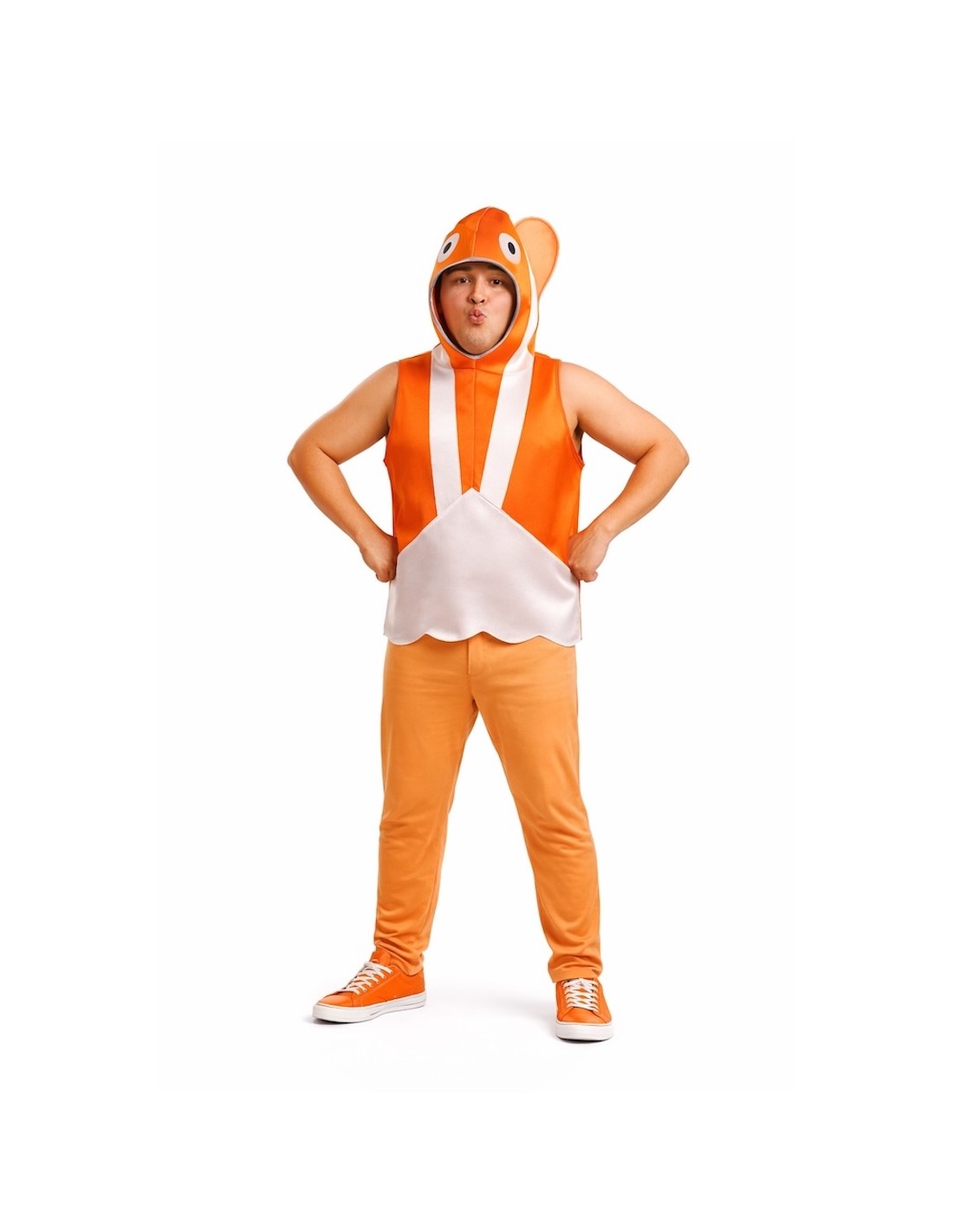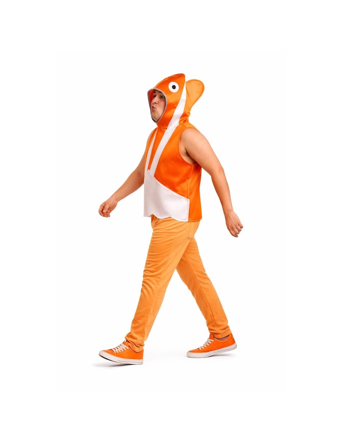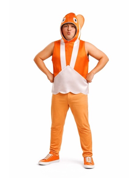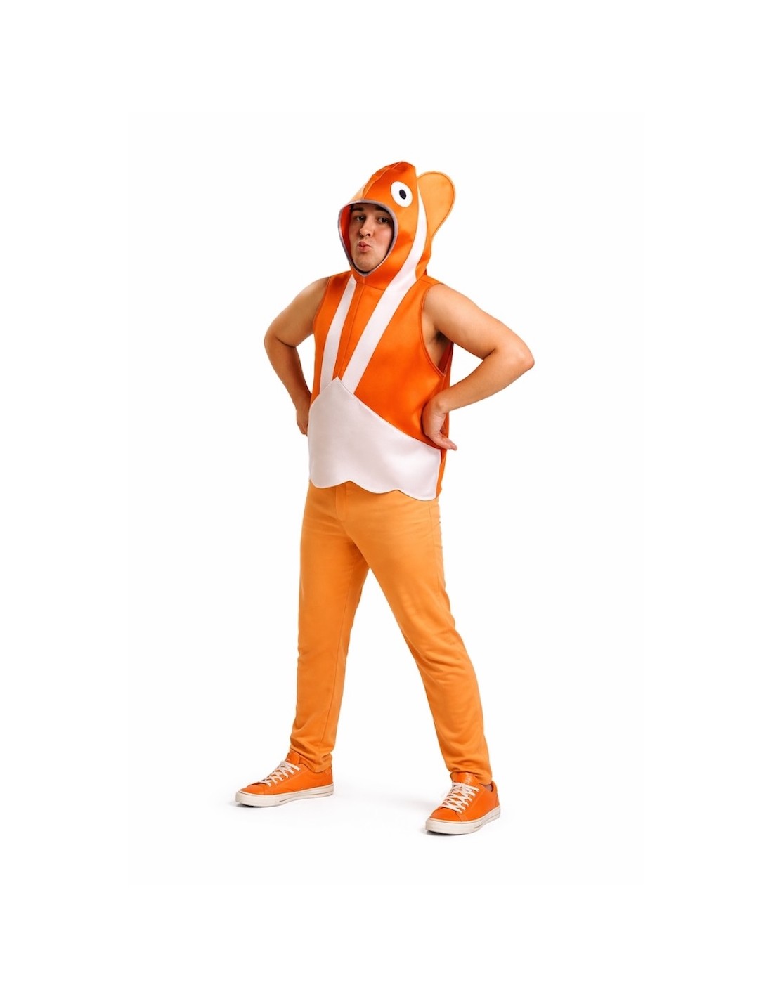 Fun fish body made of foamed polyester, which adds volume and maintains its shape. It has large side openings for the arms and a semi-elastic back in soft machine-knit fabric that allows for movement. Decorated with thick felt eyes and a striking white stripe sewn on the sides; this costume is ideal for school performances, carnivals, or themed parties. Lightweight, comfortable, and with a design that stands out!