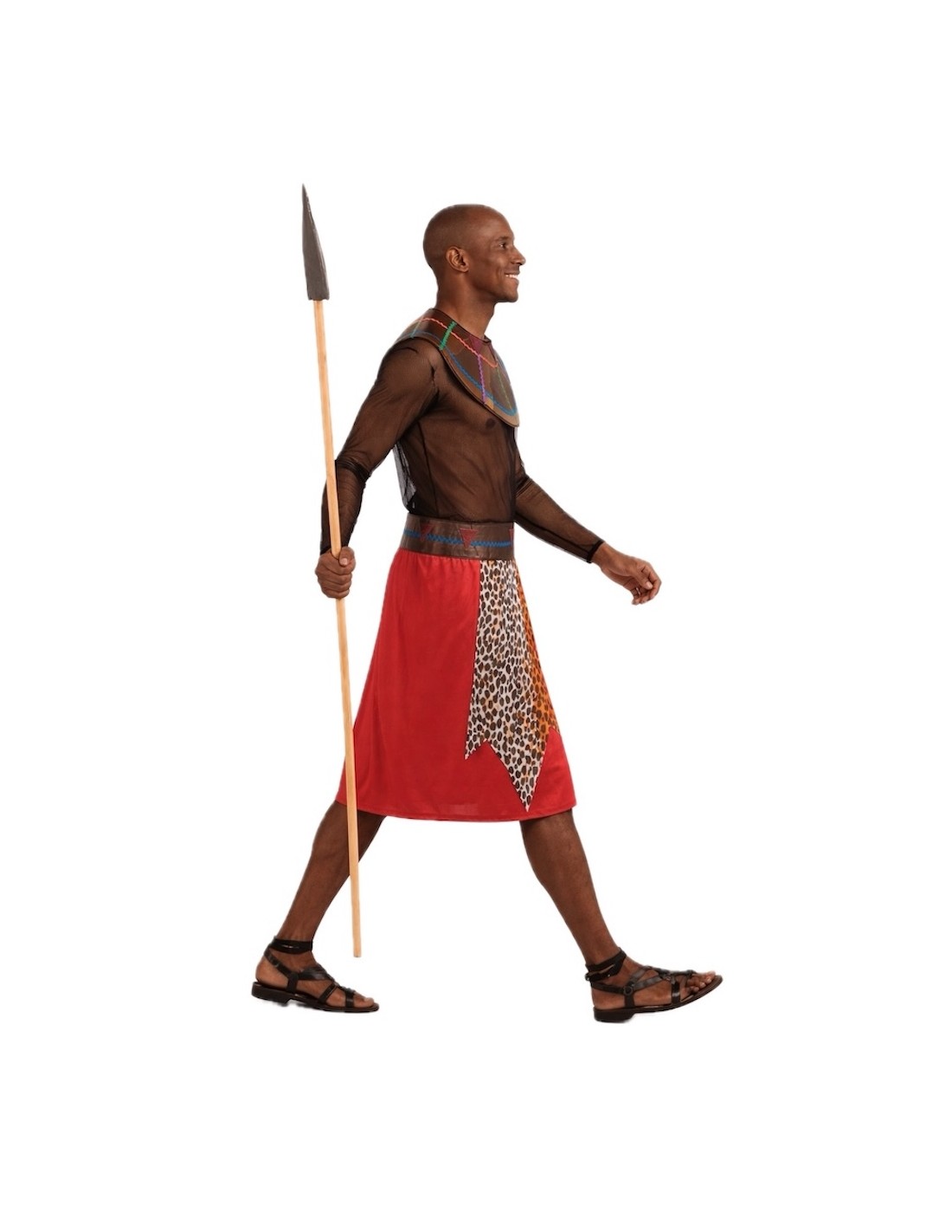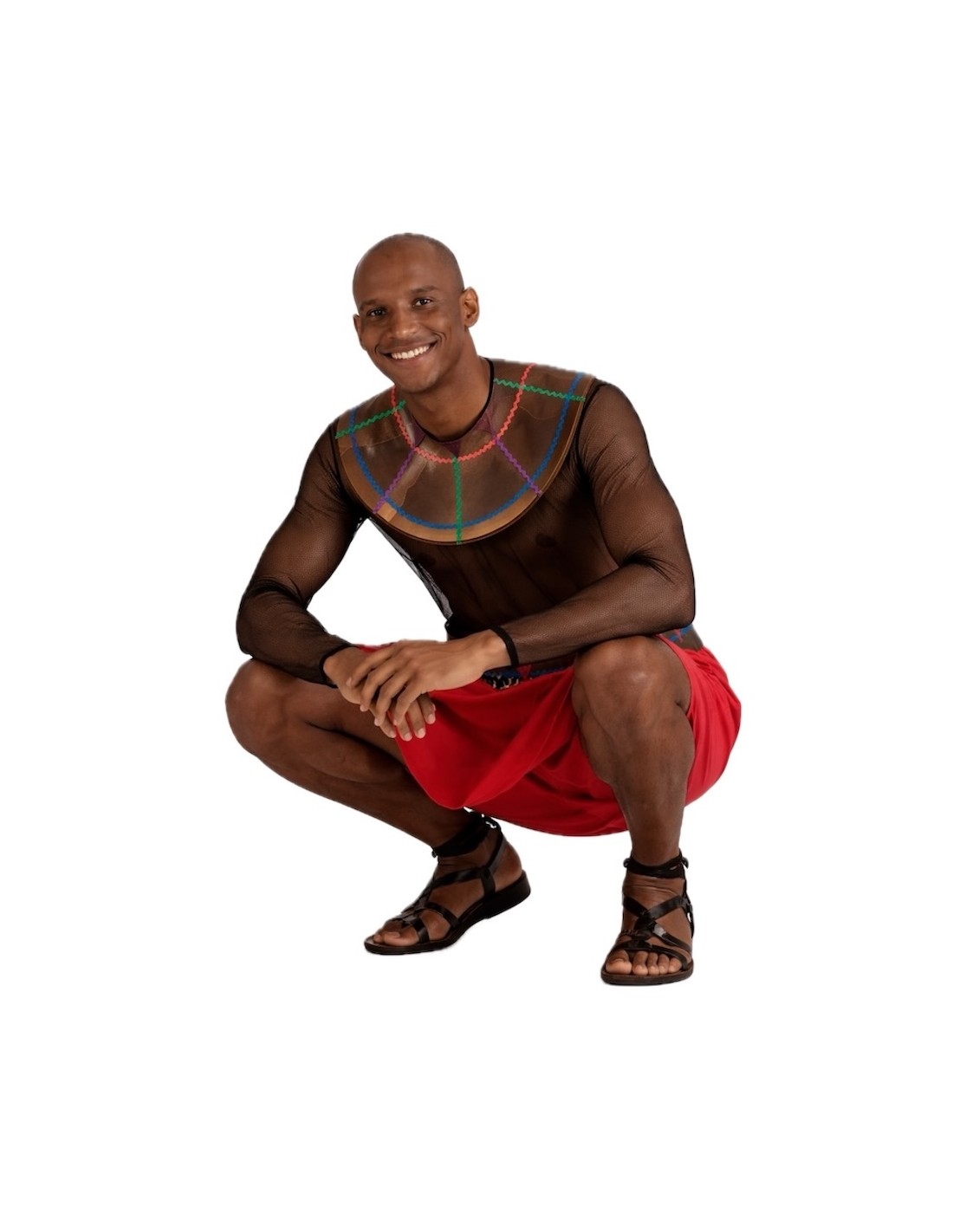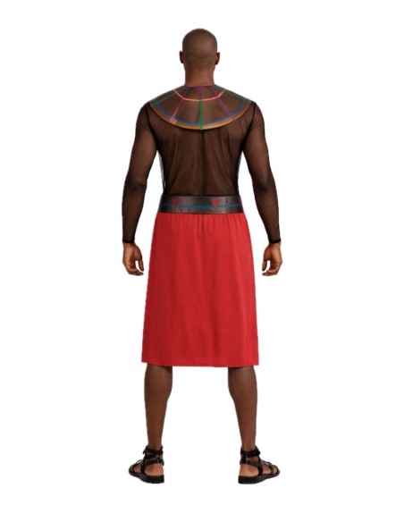 Let yourself be carried away by the African exoticism with this impressive Maasai warrior costume for men, ideal for standing out at parties and themed celebrations. It includes a semi-transparent black chiffon shirt with a velcro closure at the back, which provides the characteristic dark skin tone. Resting on the shoulders is a wide circular pectoral collar made of foamized satin, with a rear closure, decorated with multicolored motifs, wavy lines, and filter pieces that evoke the traditional Maasai bead necklaces, a symbol of warrior pride. The skirt, with a straight cut in semi-elastic point fabric with an elastic waistband, is accompanied by a matching belt, from which hangs a piece of soft fabric with an animal print. A striking ensemble, full of strength and personality, with which you will be the center of attention.