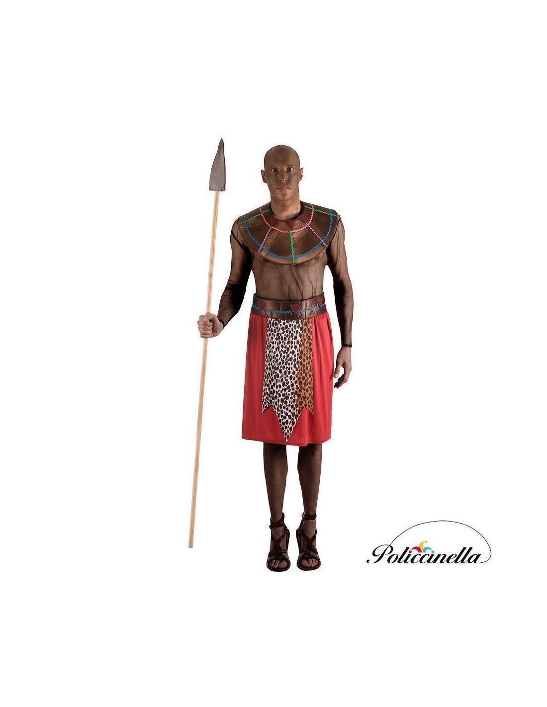 Immerse yourself in African exoticism with this impressive Maasai warrior costume for men, ideal for standing out at themed parties and celebrations. It includes a semi-transparent black chiffon shirt with a velcro closure at the back, which gives the characteristic dark skin tone effect. Resting on the shoulders is a large circular pectoral collar made of foam-backed satin, adorned with multicolored motifs, wavy designs, and filter pieces that evoke the traditional Maasai bead necklaces, a symbol of warrior pride. The skirt, with a straight cut in semi-elastic fabric with a waistband, is accompanied by a matching belt, from which hangs a piece of soft fabric with an animal print. A striking ensemble, full of strength and personality, with which you will be the center of attention.