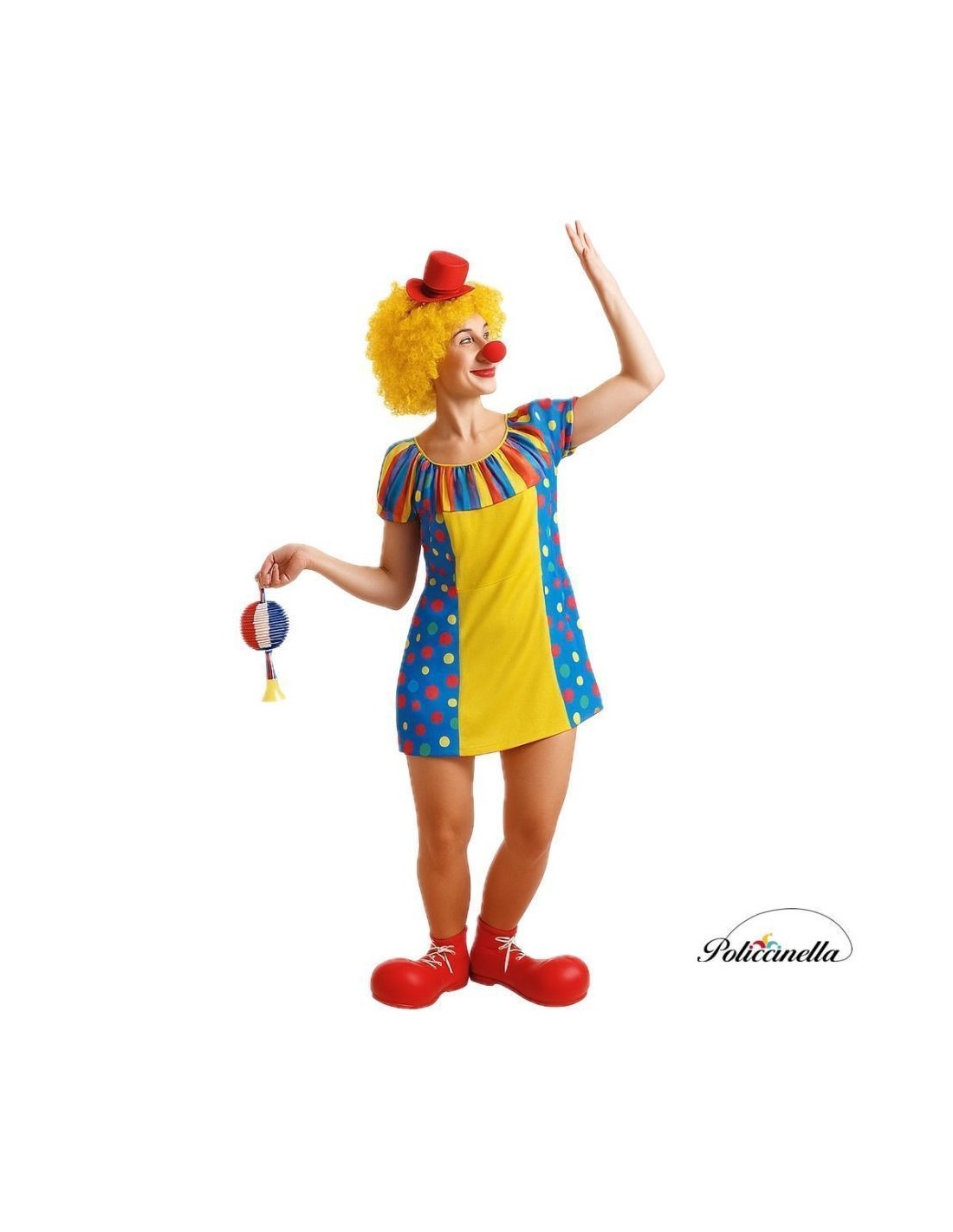 Cheerful and comfortable dress, made of soft semi-elastic machine-knit fabric. It features a box neckline with elastic for better adaptability, a waist with an integrated belt for a flattering fit, and elastic on the arms for added comfort. The front showcases a colorful and fun print, while the back is plain in a yellow tone, matching the center of the skirt. It comes with a lime green tulle bow tie with an elastic band to wear around the neck. Ideal for performances, parties, and entertainment. Comfort and charm in one outfit!