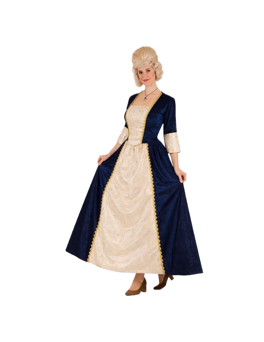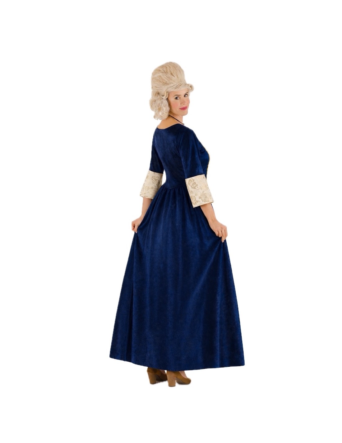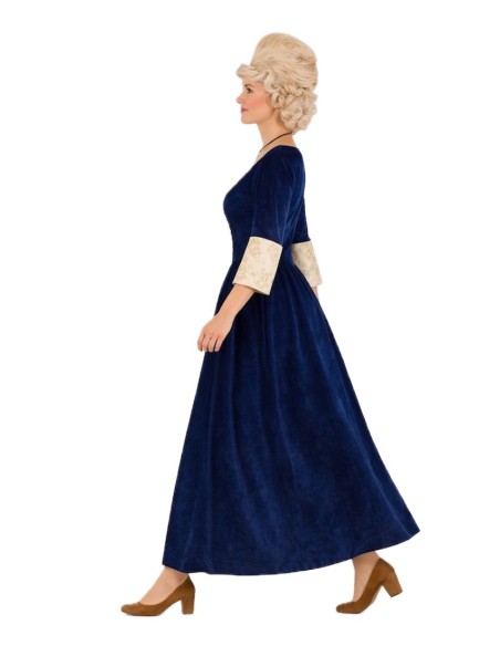 This sophisticated medieval marchioness costume combines elegance and comfort thanks to the quality of its fabrics and finishes. The set consists of two pieces: a high-neck corset with Velcro closure at the back and elastic at the waist on the back, providing a comfortable and flattering fit, and a long skirt with an elastic waist that easily adapts to a wide range of sizes (approximately from 36 to 44). Both pieces are made of soft midnight blue velvet, combined with a polyester that imitates the refined look of brocade. The gold trim details enhance the design, adding a distinguished and stately touch. A high-quality costume, ideal for historical reenactments, themed parties, or medieval events where elegance is key.