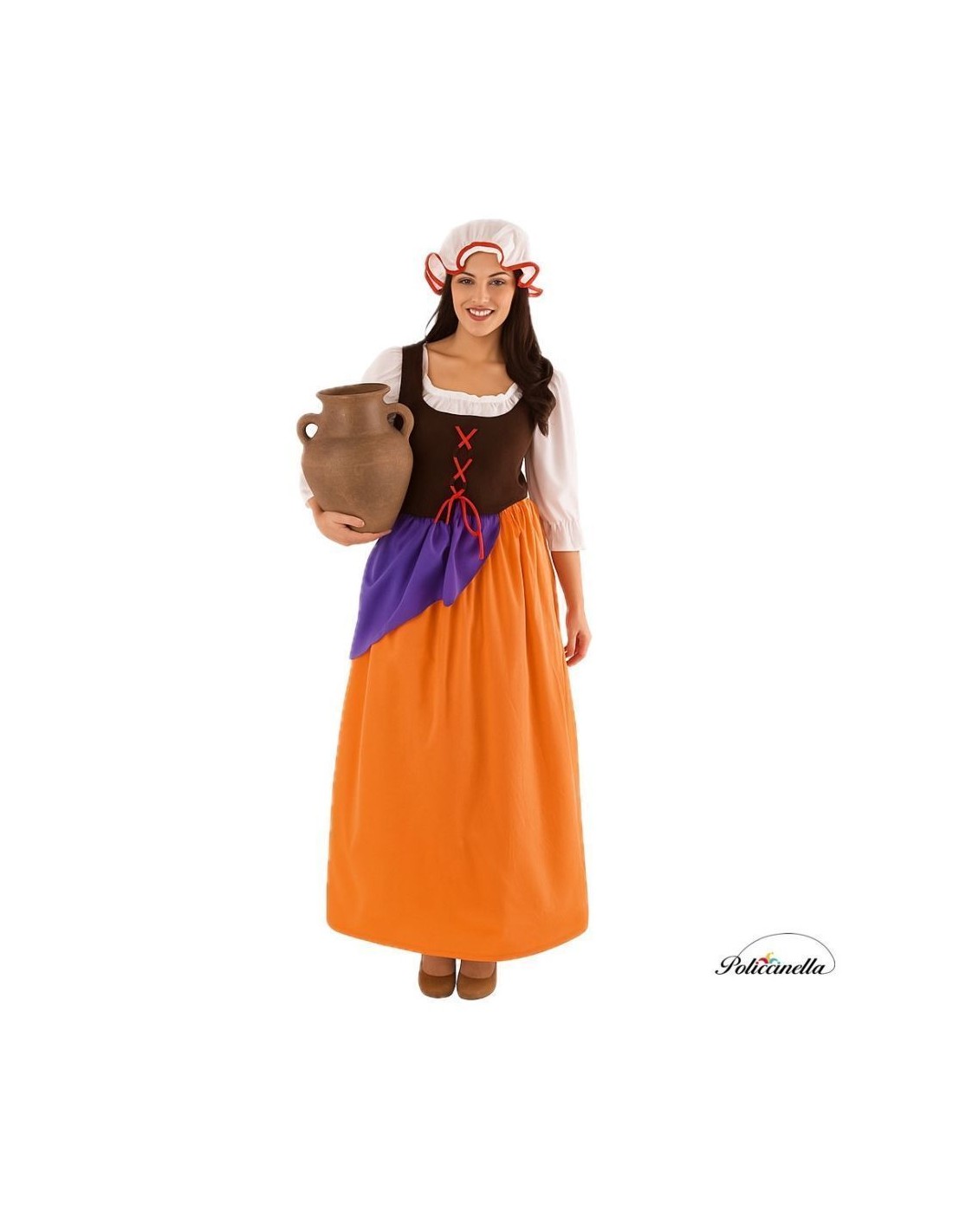 Peasant costume consisting of a blouse and vest integrated into a single garment for greater comfort. The blouse, made of white machine-knit fabric, has sleeves with elastic at the elbow and lace trim at the cuffs, as well as at the collar. The brown vest, made of peach-type polyester, has red zigzag ribbons simulating a closure and elastic at the back for a better fit. The skirt, in orange knit, includes elastic at the waist and an integrated thick purple polyester apron. It is completed with a red-trimmed elastic cap. Practical, lightweight design that visually stays true to traditional aesthetics.