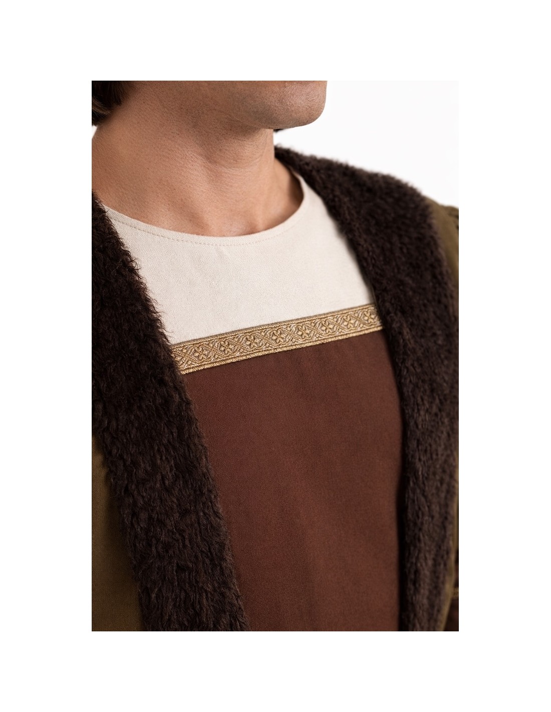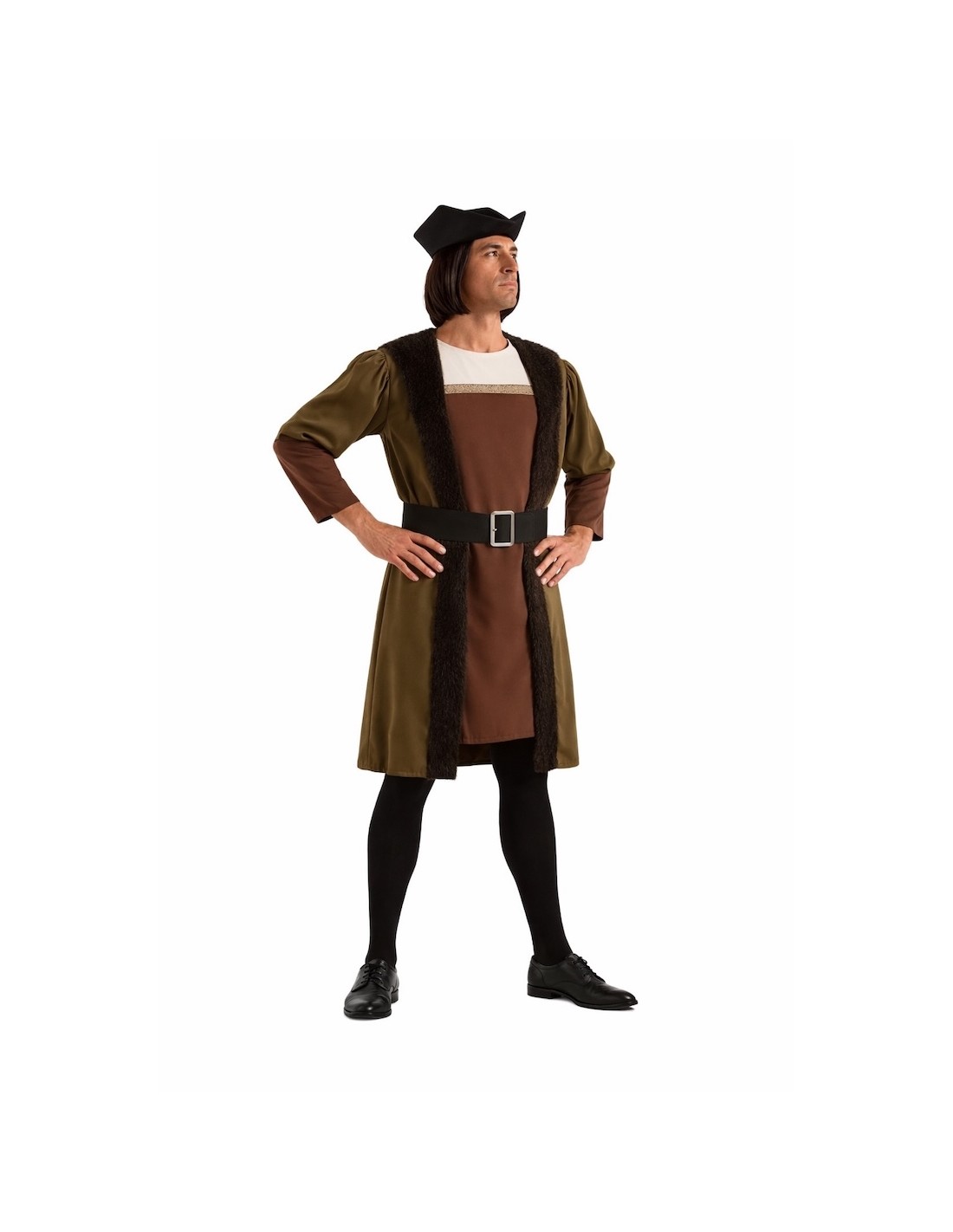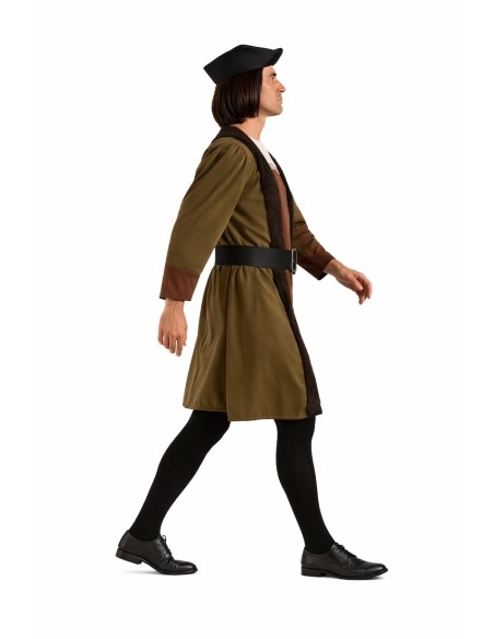 A distinguished design full of details that evoke elegance and character. The jacket combines warmth and tunic in a single piece, made of soft bronze-colored taffeta-effect satin with decorative ribbon on the chest. The coat, in thick and soft green satin, has some pieces of extra soft brown fur on the front, which provide contrast and visual richness. The puffed sleeves mix both fabrics, achieving a showy and refined finish. It is fastened with a black satin belt of great structure, adorned with a silver buckle with a metallic look. The ensemble is completed with the classic admiral's hat, made of foam-backed satin to maintain its shape and give prestige to the design. A high-quality costume, ideal for standing out at any celebration.
