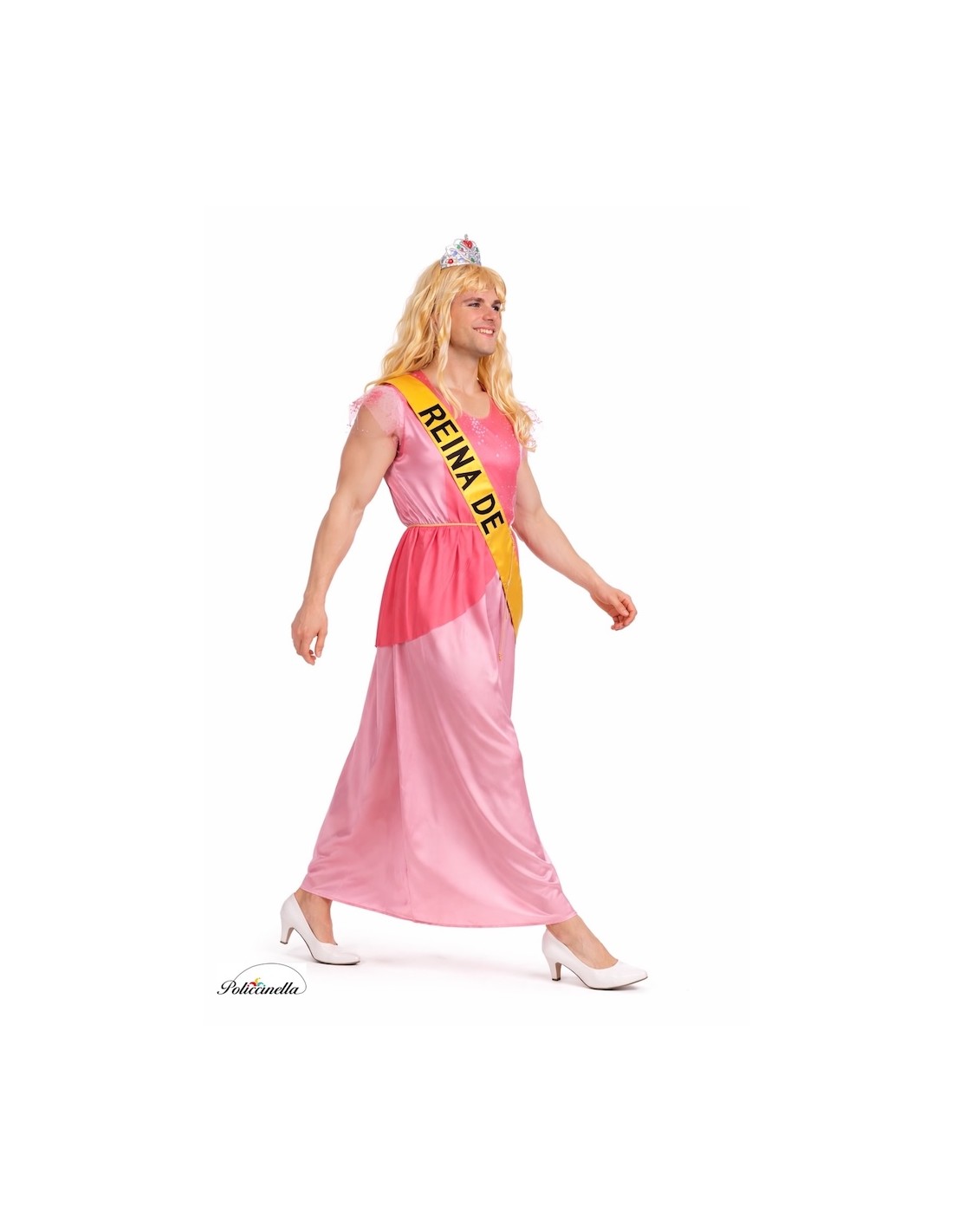 This pink princess costume, ideal for a bachelorette party, features a dress with the top part made of a soft, shiny knit fabric. This part is covered with tulle decorated with sequins, is sleeveless, and has tulle details on the shoulders. The bottom part combines a bright pink shiny fabric, of the same material as the top, which falls over the dress. The rest of the dress is made of satin. It includes a gold satin band sewn on the shoulder and a coiled cord, also in gold, that ties around the waist with a bow, adding structure and style. The closure is done with a velcro system at the back for a better fit.
