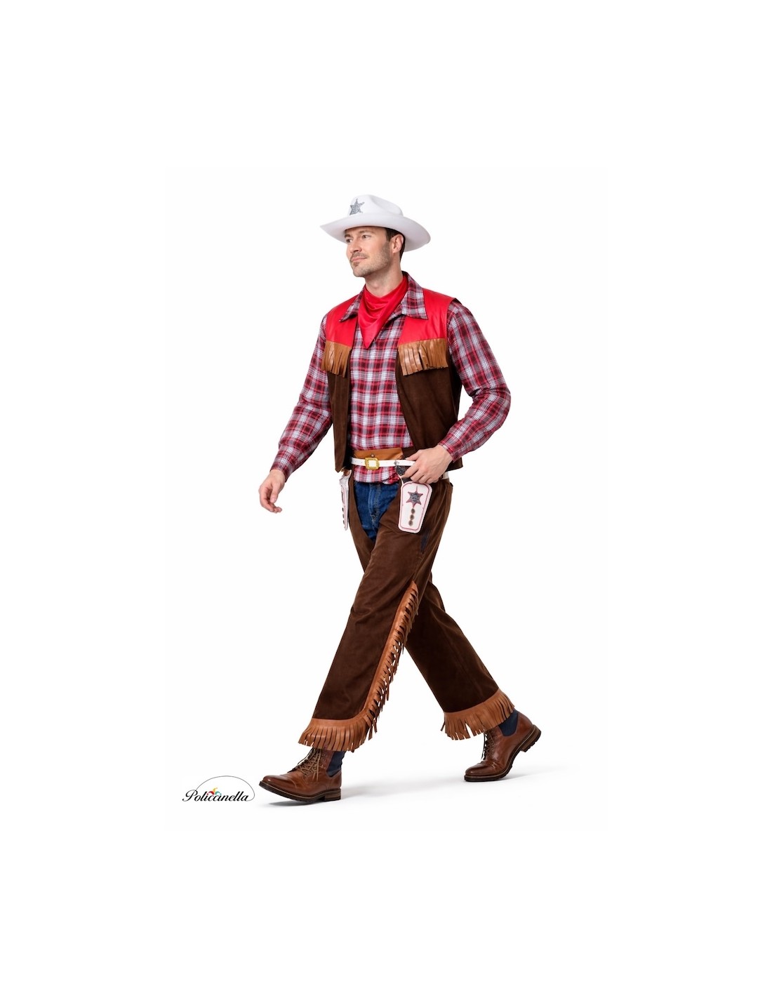 Classic western costume with a polyester shirt that has a texture similar to tablecloth and an incorporated vest that simulates two pieces. The vest combines peachskin polyester and soft knit that imitates red leather, with reinforced fringes for added weight and shape. It includes a belt with elastic and velcro, from which two fringed cartridge belts also in peachskin polyester, and decorated with plastic pieces that resemble metal, hang. The outfit is completed with a soft knit scarf to tie around the neck. Careful tailoring and comfortable fabrics with a quality finish.