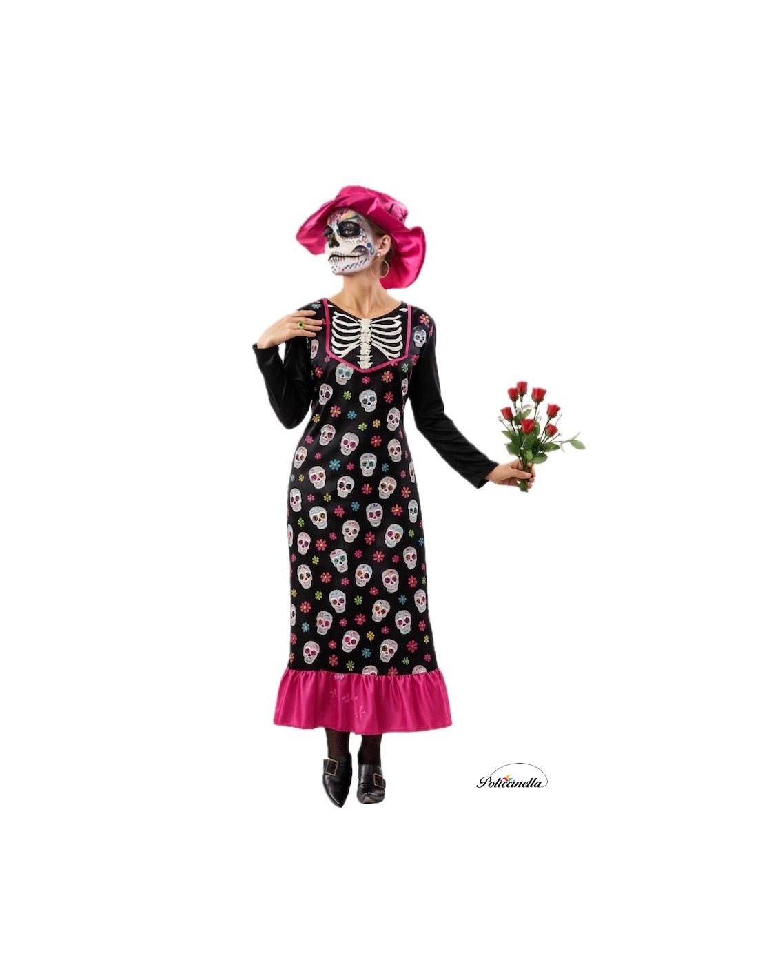 This is a dress made of soft satin, with a velcro closure at the back and semi-elastic machine-knit sleeves. At the front, at chest level, it features a digital print design, not fluorescent. The dress comes with a hat made of satin on a filter base to provide structure and firmness, thus preventing deformations.