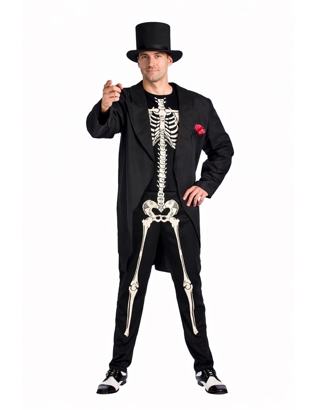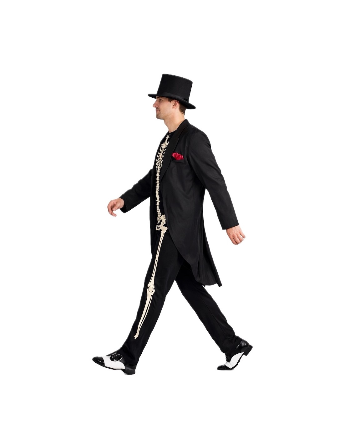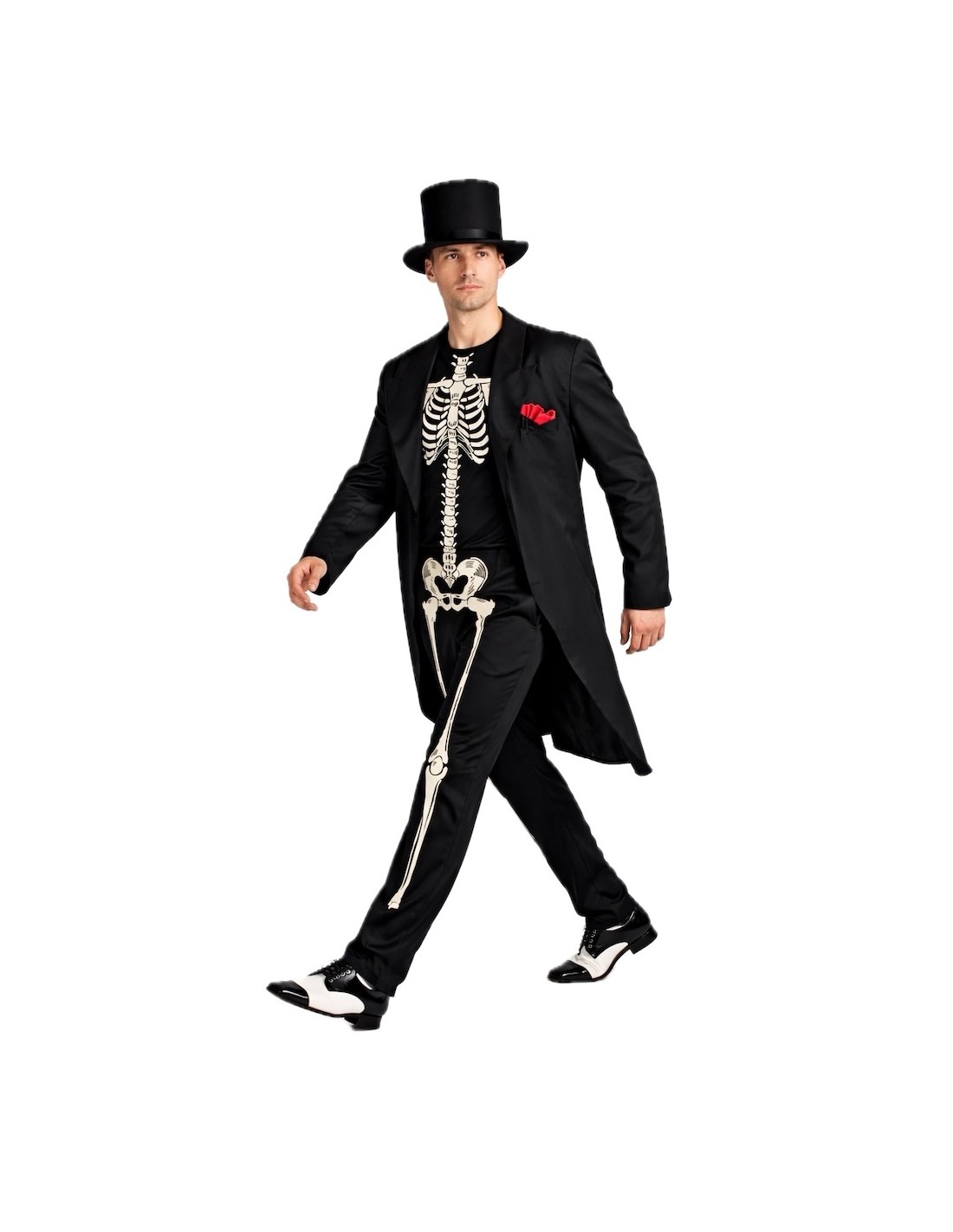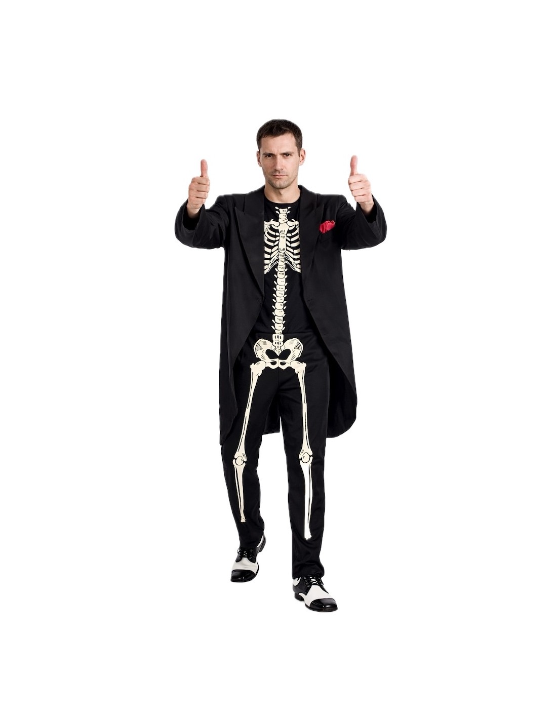 Jumpsuit made of soft semi-elastic machine-knit fabric with invisible zipper closure at the back and invisible zipper at the crotch for added comfort. The jumpsuit features a skeleton printed on the fabric itself (not fluorescent) and has no sleeves. It is accompanied by a long tailcoat-style jacket, with a fake front pocket decorated with a fuchsia piece, made of dense polyester. The jacket closes at the front with velcro. The ensemble is completed with a foamed machine-knit hat to maintain its structure and prevent deformations. Additionally, although not visible in the photograph, a belt with caravel print is included, adjustable with a velcro system, which can be worn with the suit or not.