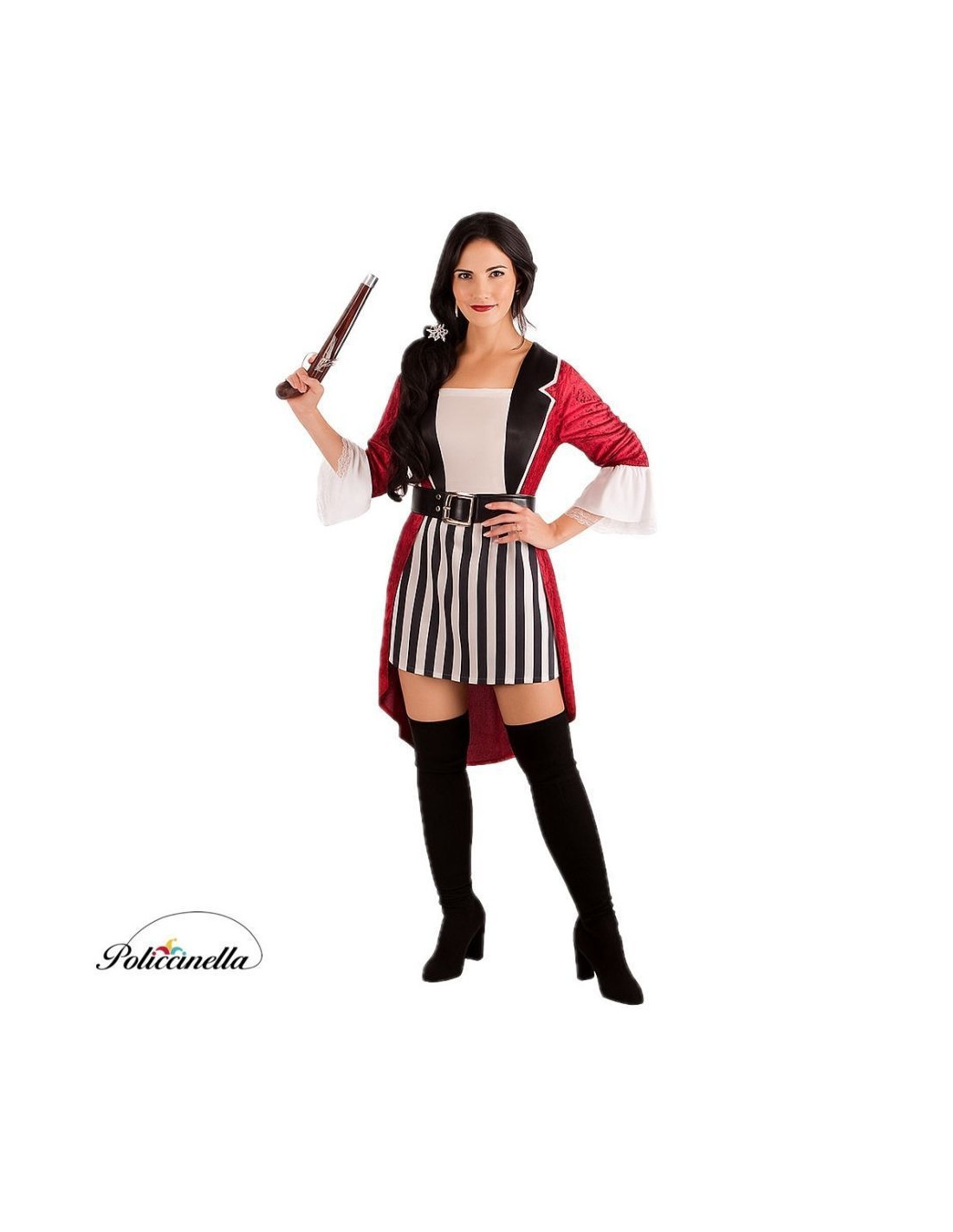 Sail the seas with style and attitude! A wine-colored velvet dress with polyester lapels over a black leather-like fabric, decorated with silver ribbons in a frock coat style. The sleeves have shiny ribbon details and end in delicate lace with a flared effect. The front part simulates an integrated shirt, with lace on the chest and a skirt with thick and soft polyester stripes. It includes a belt with a decorative buckle and a hair ribbon with a painted caravel.