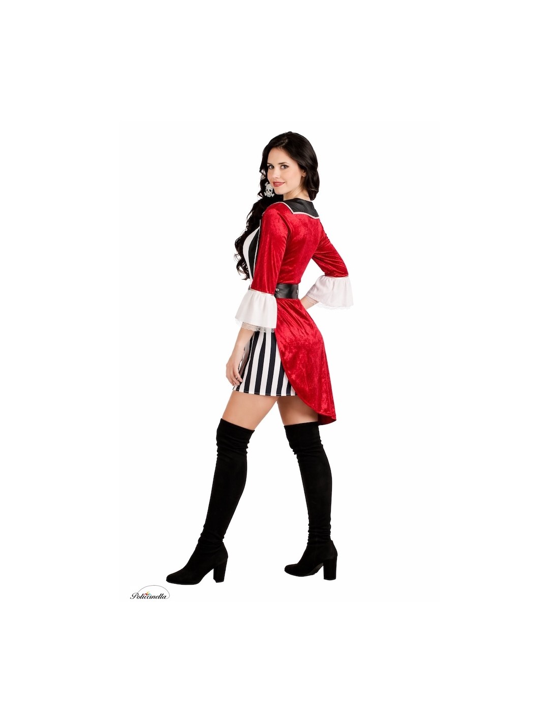 Sail the seas with style and attitude! Wine-colored velvet dress with polyester lapels on a black leather-imitation fabric, decorated with silver ribbons in a frock-coat style. The sleeves have shiny ribbon and end in delicate lace with a flared effect. The front part simulates an integrated shirt, with lace on the chest and a skirt with thick and soft polyester stripes. Includes a belt with a decorative buckle and a hair scarf with a painted caravel.