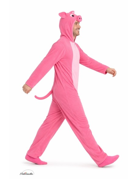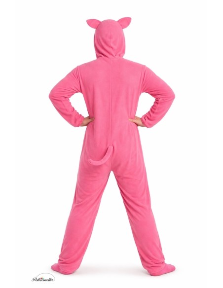 Adorable pig costume with full-body suit, made of super soft and pleasant plush-like fabric, with an invisible zipper at the front. The integrated hood, made of the same material, is foam-lined to maintain its shape, with eyes and nose made of dense felt attached. On the back, the cute curled tail has an internal wire to mold it and maintain its shape. Light, comfortable, and with high-quality finishes.