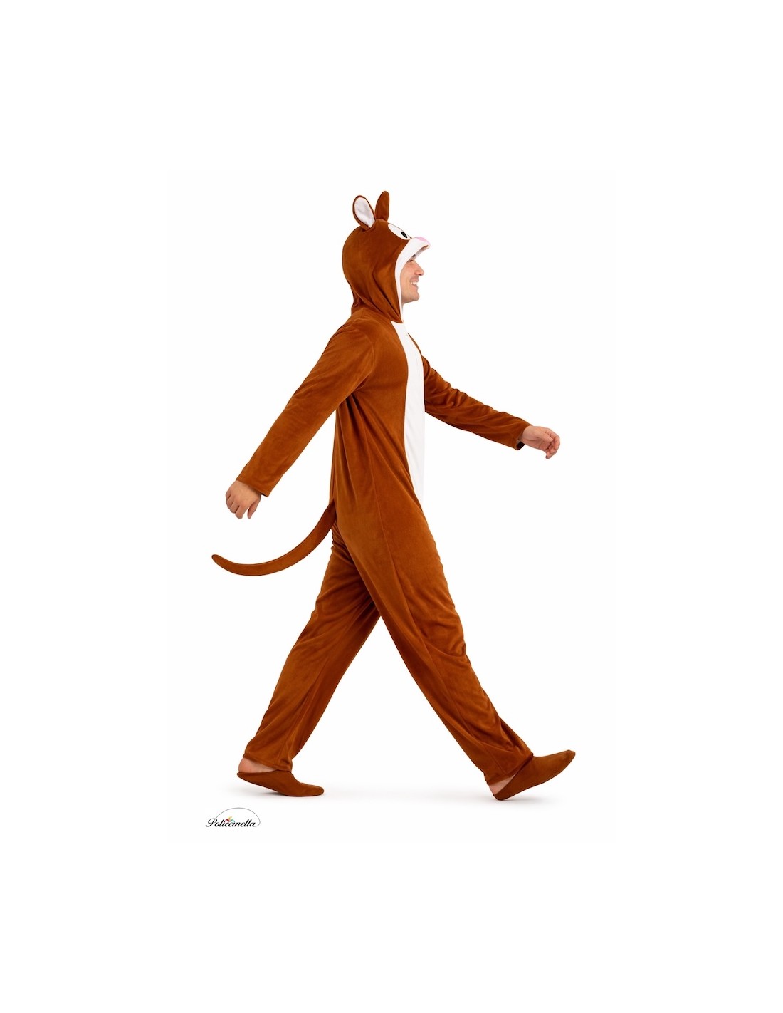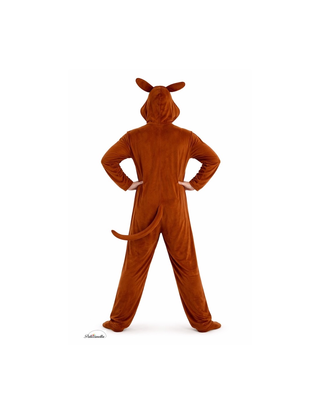 Cute and funny rabbit costume, with a one-piece jumpsuit made of peach-like polyester with an invisible front zipper. The integrated hood, foam-filled to maintain its shape, features eyes and teeth made of dense felt, ears with rigid filling to keep them upright, and a soft and fluffy nose attached to the fabric. In the back, a cute pom-pom made of sherpa fabric simulates the characteristic little tail. Light, comfortable, and full of charm.