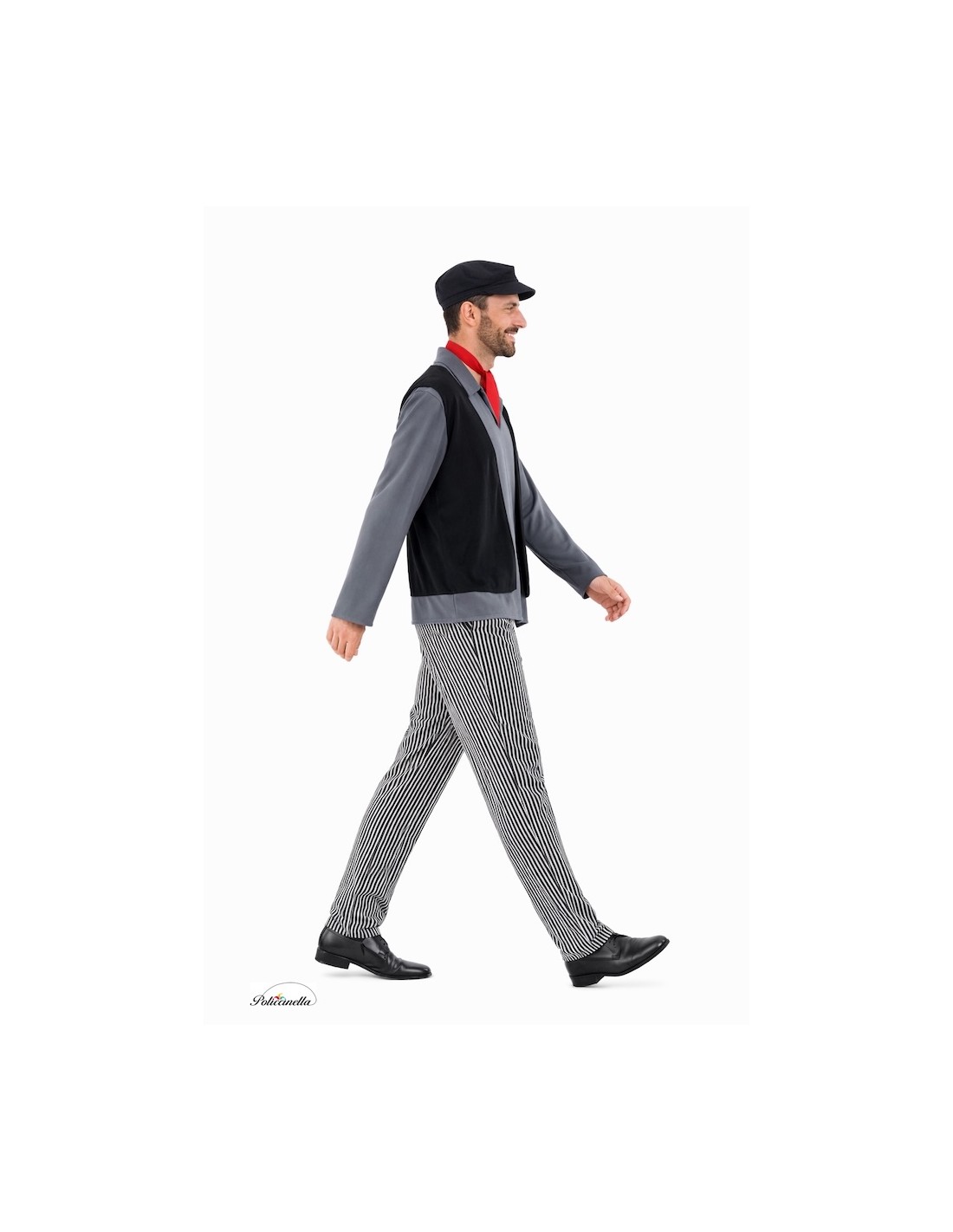 Complete chimney sweep costume with a soft, semi-elastic machine-knit shirt and an integrated vest in peachy fabric, creating the effect of two garments in one. Matching pants with elastic waistband for added comfort and a small interior pocket. Includes a neckerchief and cap, both with a peachy texture; the cap is gathered with a fluffy visor to maintain its shape. A comfortable and detail-rich ensemble for an authentic look.