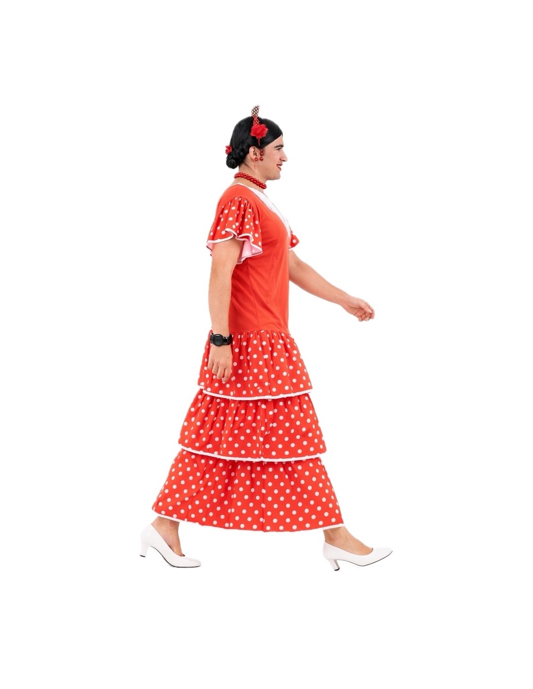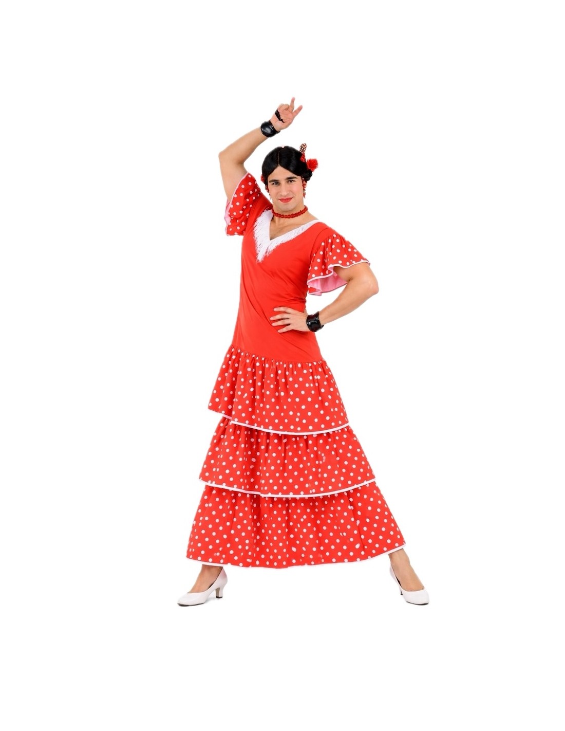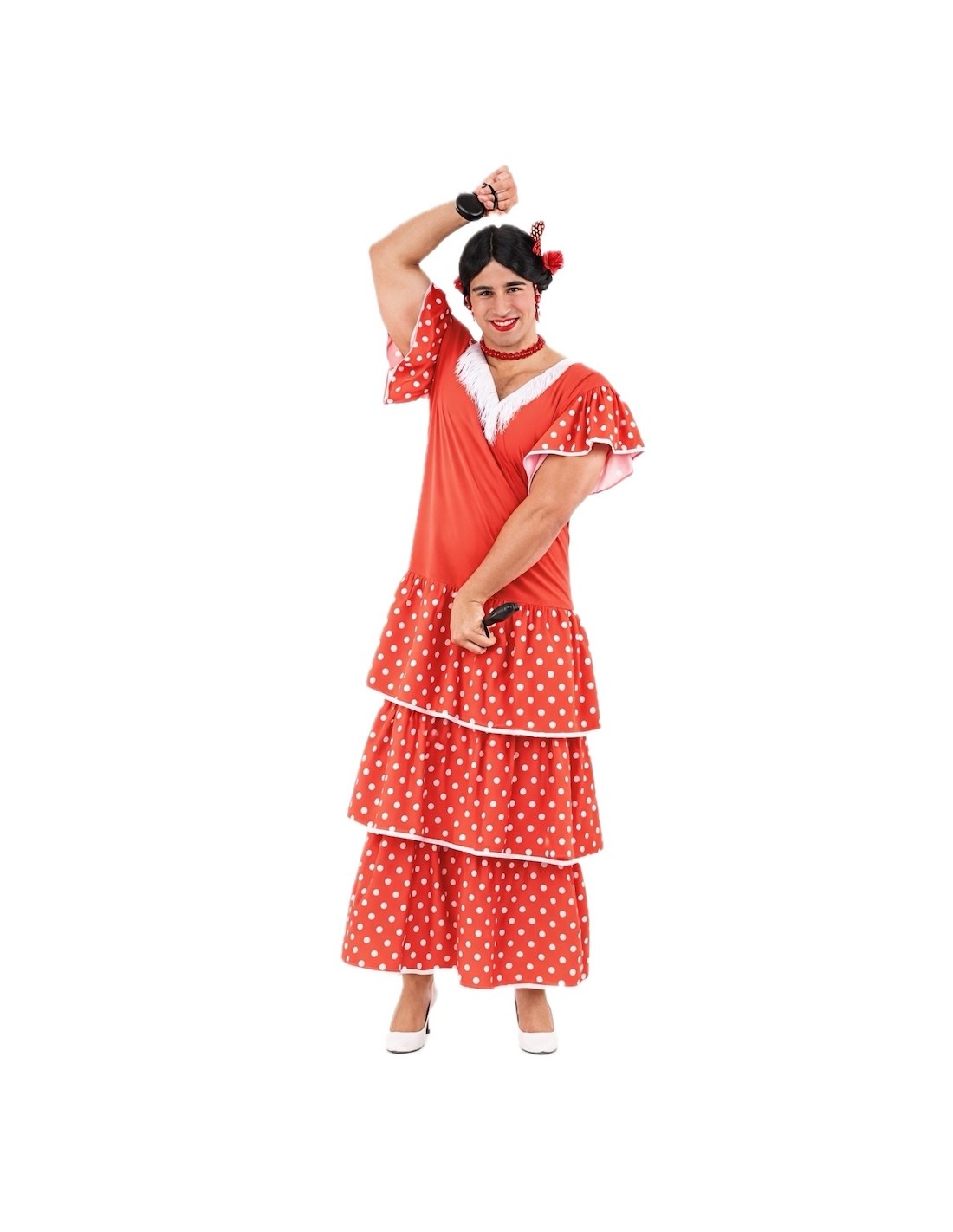 Fun Sevillana costume for men, perfect for bachelor parties and humor-filled parties. Made of soft, semi-elastic knit fabric, with ruffles made of lightweight polyester decorated with satin ribbons. The front and back neckline feature classic fringes, and the chest incorporates internal sponges to add volume and enhance the comedic touch. Comfortable, lightweight, and with all the details to stand out.