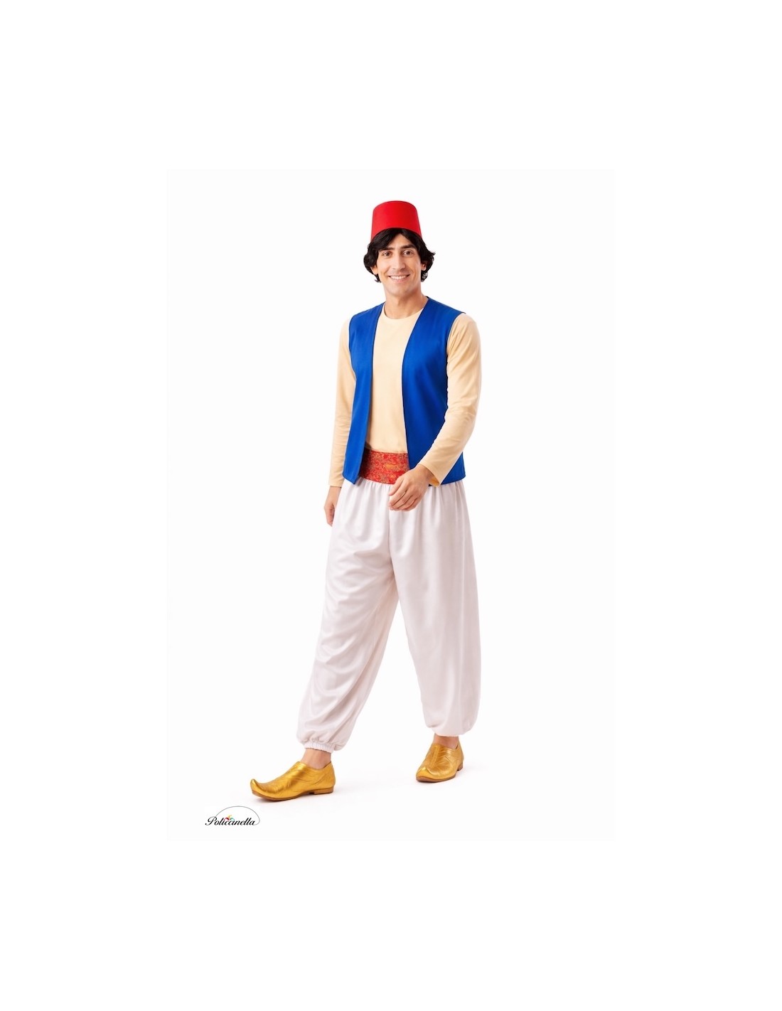 Beautiful costume consisting of a soft, semi-elastic machine-knit shirt with velcro closure at the nape, a vest, and satin pants with elastic waistband and ankles, as well as small interior pockets. It includes a brocade sash with velcro adjustment on the back and the classic hat (fez or tarbush) made of foamed satin to maintain its shape without deforming. Lightweight, comfortable, and with careful finishes for an authentic look.