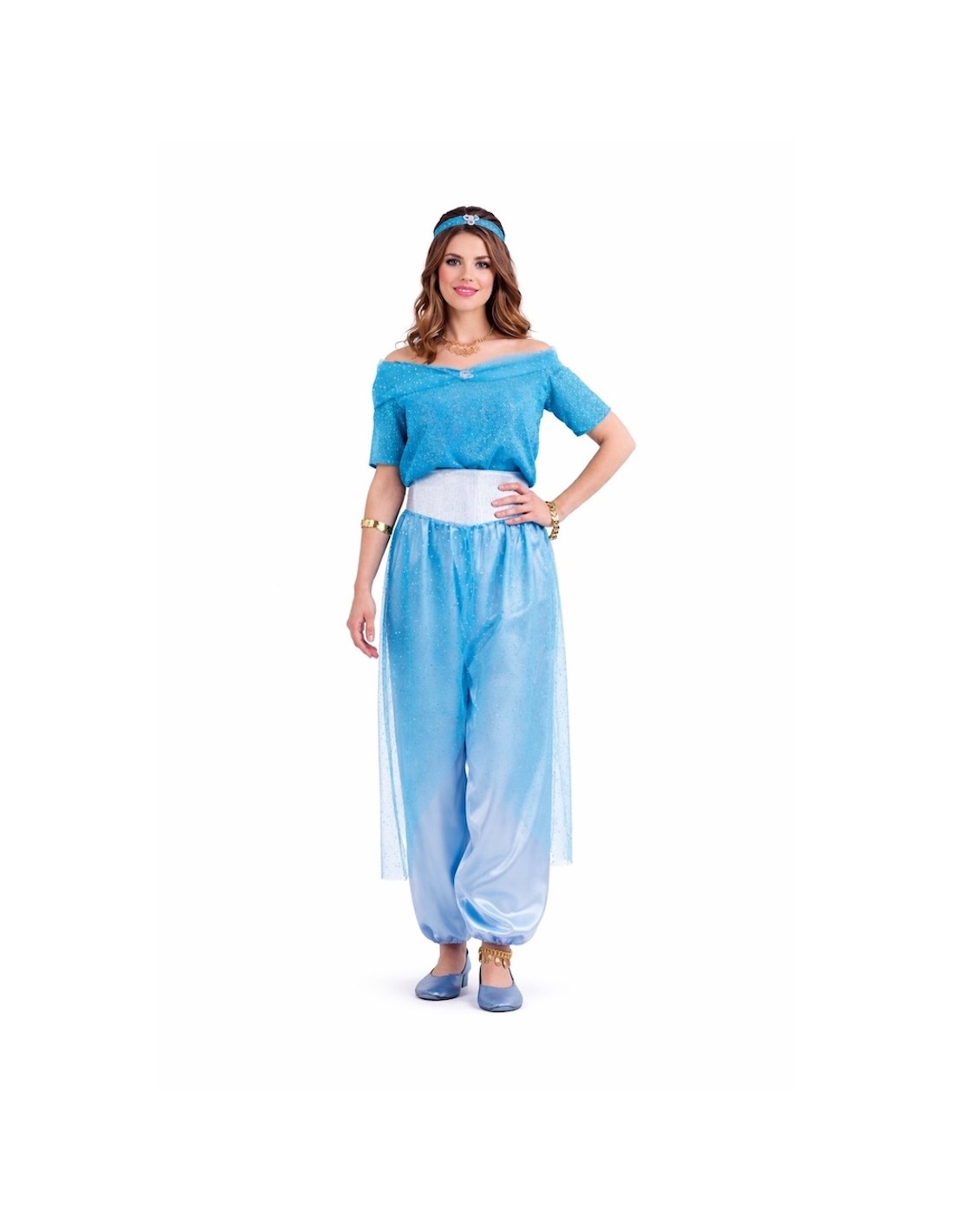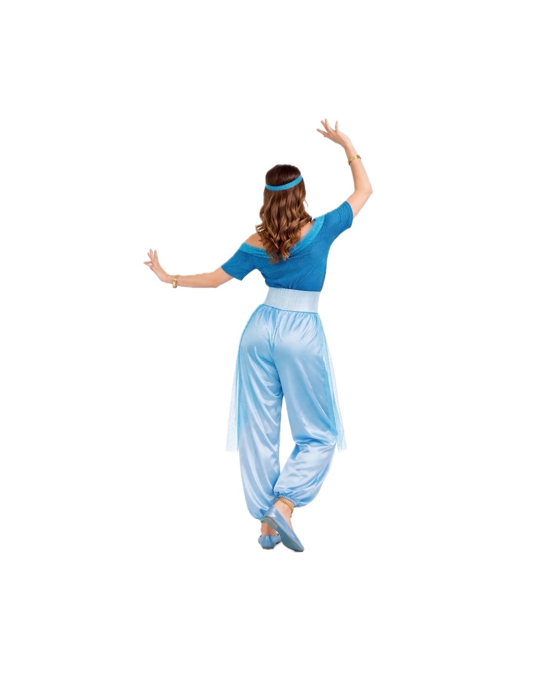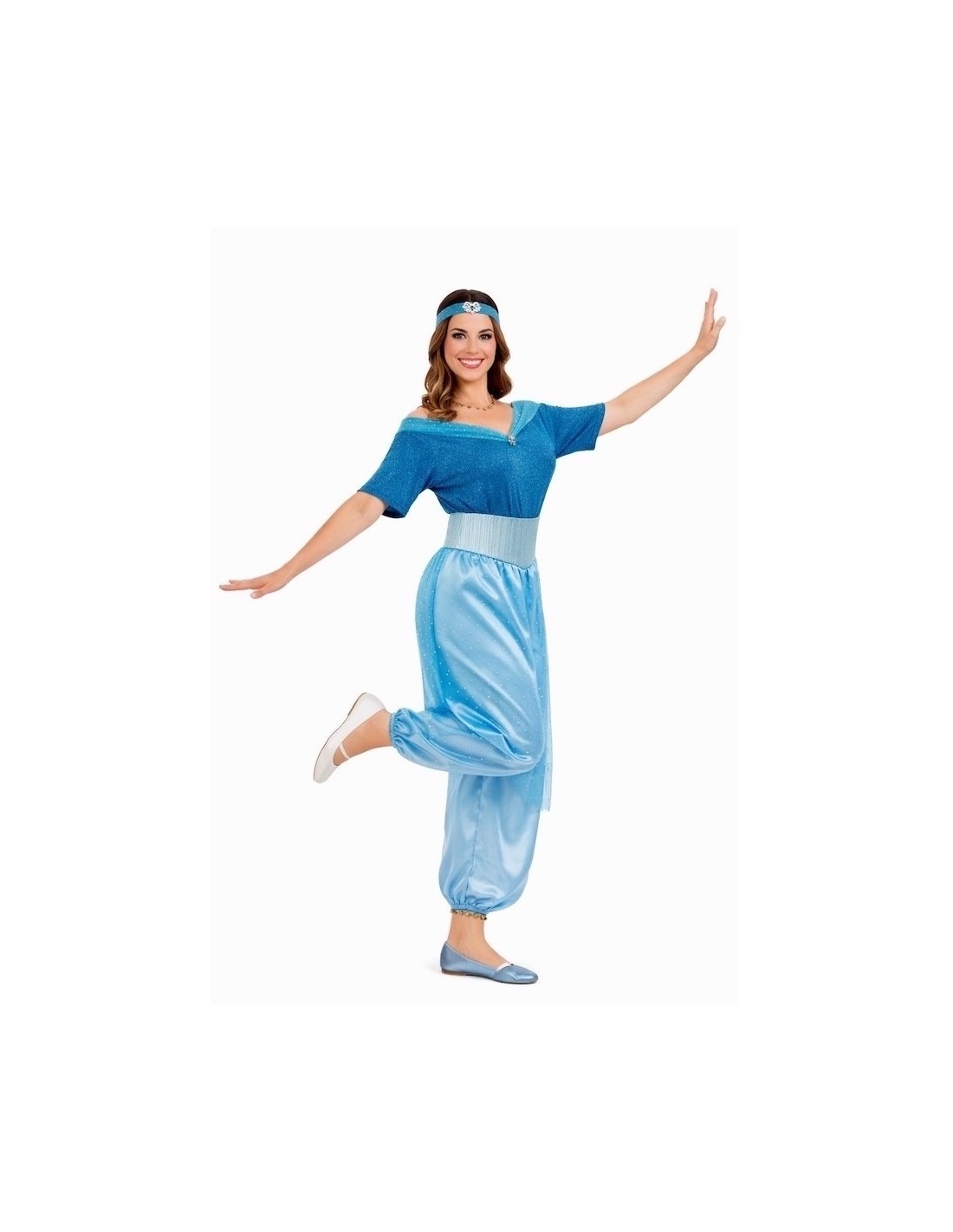 This elegant costume, made of soft satin, consists of a shirt decorated with sequins and tulle with a silver sequin trim on the collar. The sash, in silver blue color and adorned with tulle and silver details, falls over the pants and closes with velcro at the back. The pants are made of soft satin and have an elastic waistband. The ensemble is completed with a sequined turban that coordinates with the shirt's ornament.
