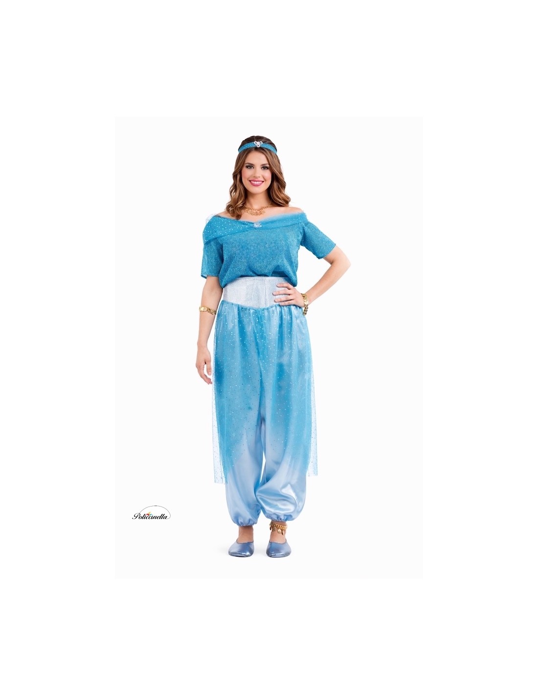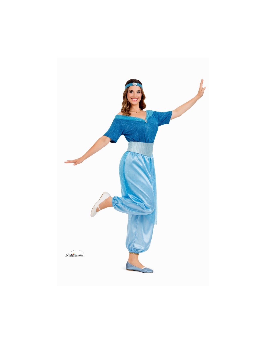 This elegant costume, made of soft satin, consists of a shirt decorated with sequins and tulle with a silver sequin trim on the neckline. The sash, in silver-blue color and adorned with tulle and silver details, falls over the pants and closes with velcro at the back. The pants are made of soft satin and have an elastic waist. The ensemble is completed with a sequined turban that coordinates with the shirt's decoration.