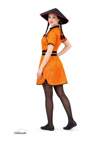 Dress inspired by the classic Chinese suit, made of soft satin with a tangzhuang-style design. It simulates the typical diagonal closure and Mao collar. It fits comfortably with an invisible zipper at the back. Both the hem of the skirt and the sleeves are trimmed to harmonize with the collar and the side chest adornment. The outfit is completed with the traditional foanized Chinese hat, equipped with an inner headband to ensure a firm and comfortable fit, thus preventing it from falling off. Also, a foanized belt with a velcro closure at the back. An authentic garment full of oriental charm.