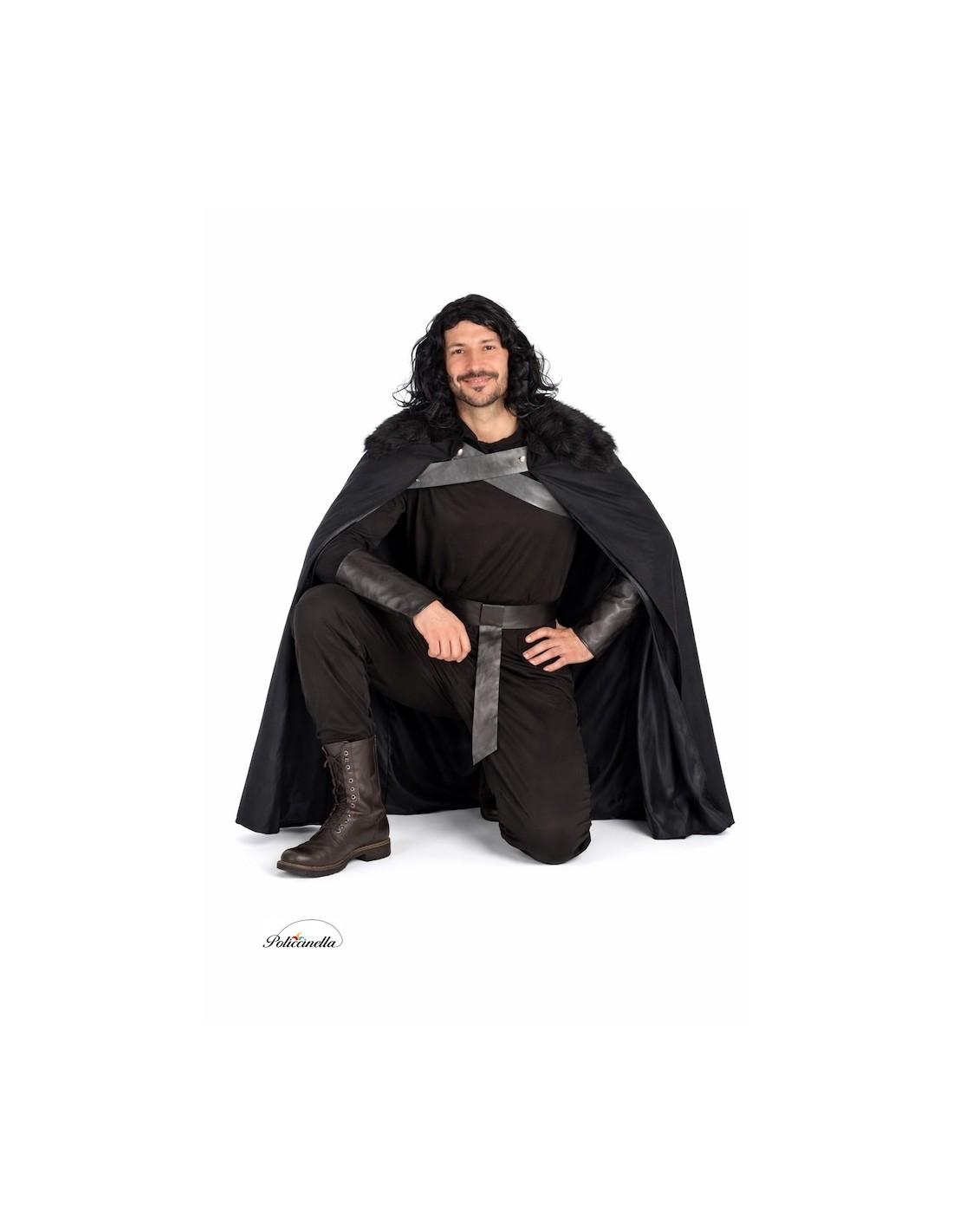 Medieval warrior costume consisting of a shirt, pants, cape, and belt, made of machine-knit fabric for greater comfort and mobility. The long-sleeved shirt features a Velcro closure at the neck. The pants have an elastic waist and a functional inner pocket. The cape includes a high-density synthetic fur collar and a front closure with crisscrossed polyester leather-like straps and decorative plastic buckles. The belt, reinforced with felt, adjusts with Velcro. Technical design, lightweight, and versatile.