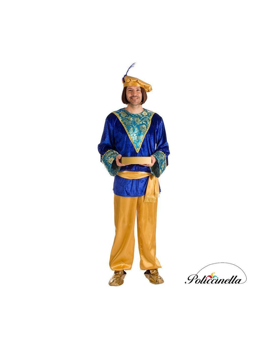 This page costume dazzles with its high-quality construction and the elegance of its finishes. The jacket, made of soft-touch electric blue velvet, fastens at the neck with velcro and features a spectacular front and sleeves decorated with brocade fabric reminiscent of damask and golden trim, giving it a majestic look. The pants, made of golden satin, have elastic at the waist and ankles for a comfortable fit, while the sash, also in satin, is adorned with golden fringes that add distinction. The puffy hat, made of matching satin and topped with a feather, completes the ensemble. The highlight of the costume is undoubtedly the luxurious brocade of the jacket, which brings authenticity and nobility. A soft, eye-catching, and distinguished outfit, perfect for parades, living nativities, and Christmas celebrations full of tradition. "The fabric pattern may vary slightly from the one shown in the photograph, while always maintaining the same quality and style."