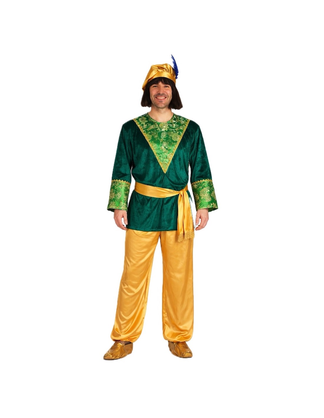 This page costume dazzles with its high-quality craftsmanship and the elegance of its finishes. The jacket, made of soft green velvet, fastens at the neck with Velcro and features a spectacular front and sleeves decorated with brocade fabric reminiscent of damask and golden trim that give it a majestic look. The pants, made of golden satin, have elastic at the waist and ankles for a comfortable fit, while the sash, also made of satin, is adorned with golden fringes that add distinction. The puffy hat, made of matching satin and topped with a feather, completes the ensemble. The highlight of the costume is undoubtedly the luxurious brocade of the jacket, which adds authenticity and nobility. A soft, eye-catching, and distinguished outfit, ideal for parades, living nativity scenes, and Christmas celebrations full of tradition.
