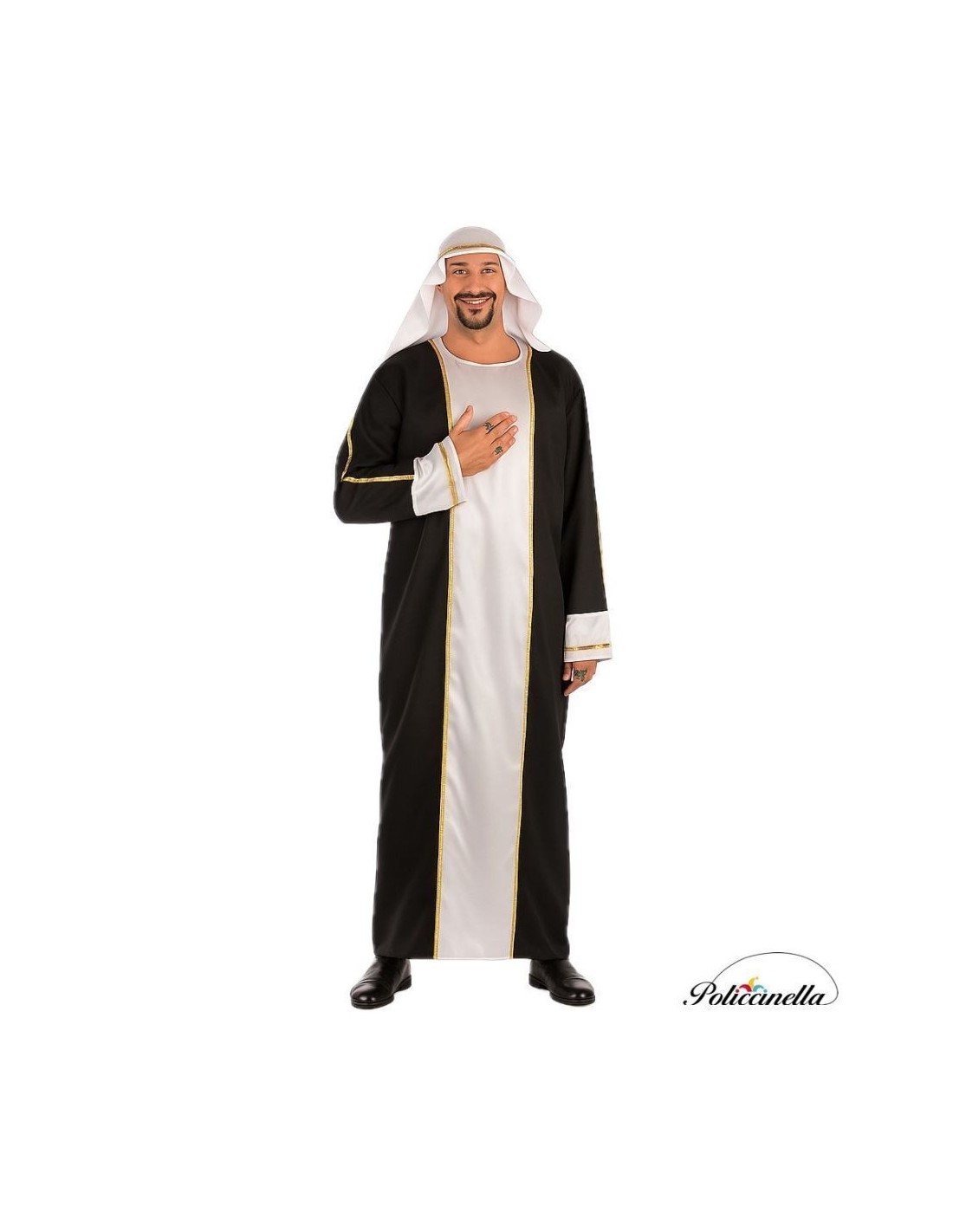 Look elegant and authentic with this sophisticated Arab sheikh costume. It includes a long, dense polyester tunic with a satin front panel, enhanced with delicate golden trim. The sleeves feature the same detail, with trim that highlights the seams and adds distinction. It is completed with the traditional kufiya or white satin headscarf, secured with an elegant golden cord.
