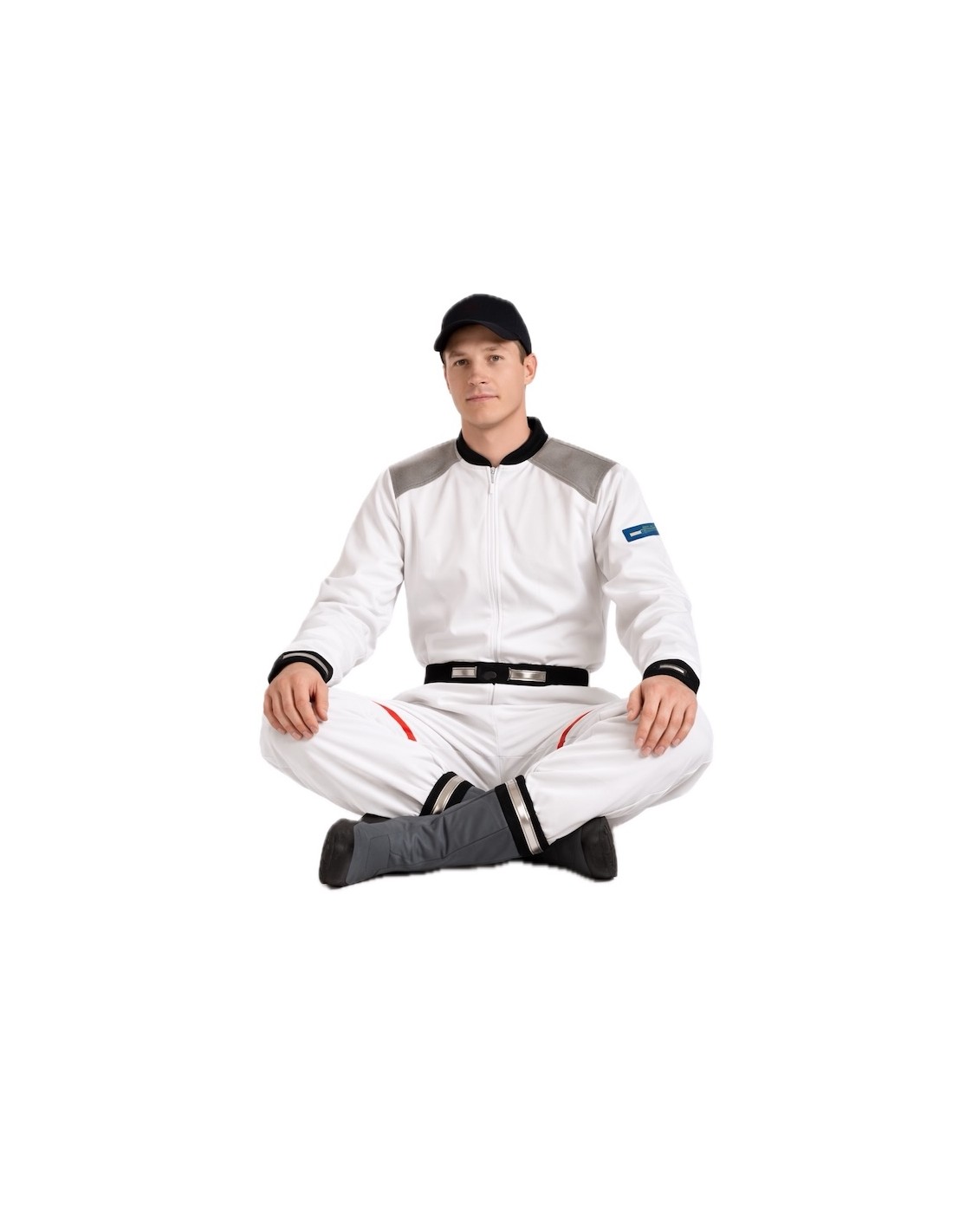 Dense polyester jumpsuit that combines comfort and durability, designed with a front invisible zipper for a clean and sophisticated finish. Details carefully structured on the collar, shoulders, cuffs, and belt, all foam-padded to add volume and an authentic look. The adjustable belt with velcro closure on the back ensures a perfect and comfortable fit. Complete the experience with a foam-padded helmet that enhances the futuristic and professional presence of the ensemble.