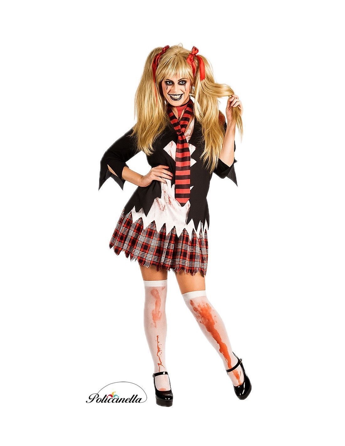 A costume with a lot of style... and a touch of terror! It includes a thick polyester jacket with a distressed effect, simulating a zombie look. The jacket features an integrated inner t-shirt made of soft semi-elastic knit fabric and an elastic band on the back waist for a better fit. The schoolgirl-style skirt has a plaid pattern, felt-like texture, elastic waistband, and a hidden inner pocket. The ensemble is completed with a long and narrow scarf-like tie, also made of soft knit fabric, for a very "undead chic" final touch.