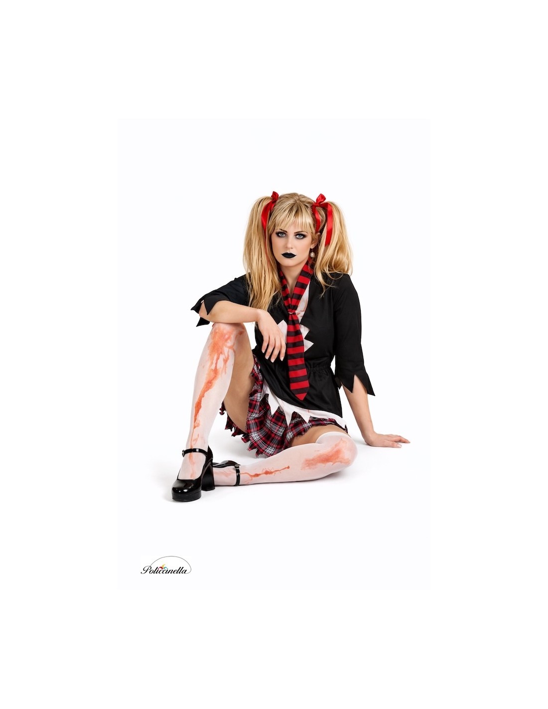 A costume with a lot of style... and a spooky touch! It includes a thick polyester jacket with a worn-out effect, simulating a zombie look. The jacket features an integrated inner t-shirt made of soft semi-elastic knit fabric and an elastic band at the back waist for a better fit. The schoolgirl-style skirt has a plaid print, a cloth-like texture, an elastic waistband, and a hidden inner pocket. The outfit is completed with a long, narrow scarf-like tie, also made of soft knit fabric, for a very "undead chic" final touch.