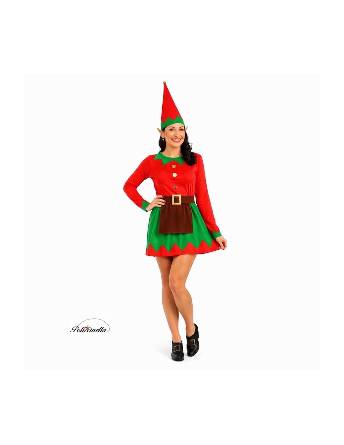 Charming dress made of semi-elastic machine-knit fabric, soft to the touch, with a gathered waist for a flattering fit. The neck and skirt have a peach-like texture, adorned with golden button-shaped appliques that add a shiny and festive touch. The brown apron, sewn to the skirt, adds a traditional nod to the design. It includes a felt belt with a gold foanized buckle and Velcro closure, and a conical-shaped hat with peach-colored trim and a gold ornament on the tip. A high-quality ensemble for an unforgettable elf.