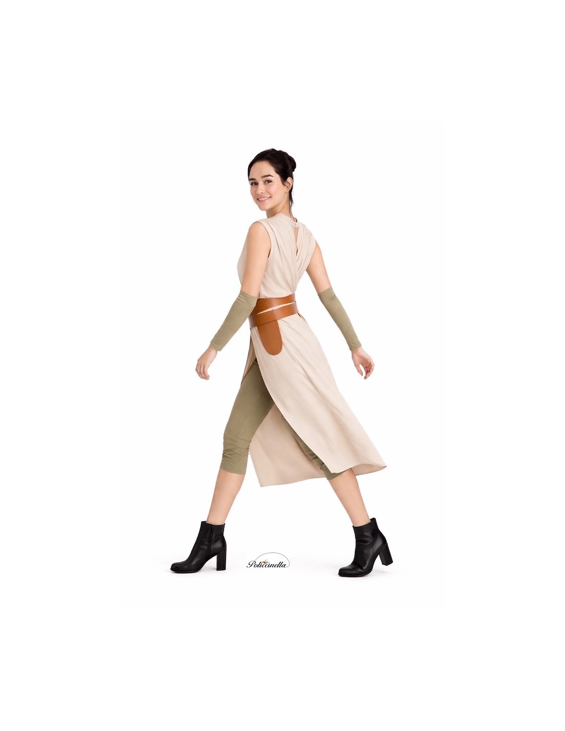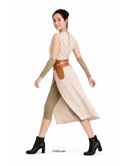 A design inspired by space adventure, made of soft semi-elastic machine-knitted fabric with a cotton-like effect that provides comfort and lightness. The V-neck t-shirt features two crossed pieces on the front to enhance the silhouette, held together by a polyester belt with a TNT base that provides structure and is fastened at the back with Velcro. The set includes matching pants with an elastic waist, an inner pocket, and elastic at the bottom for a comfortable fit at the knee. To complete the outfit, it comes with arm covers with elbow elastic that ensure a perfect fit. A well-made costume, practical and full of details that evoke strength and galactic style.