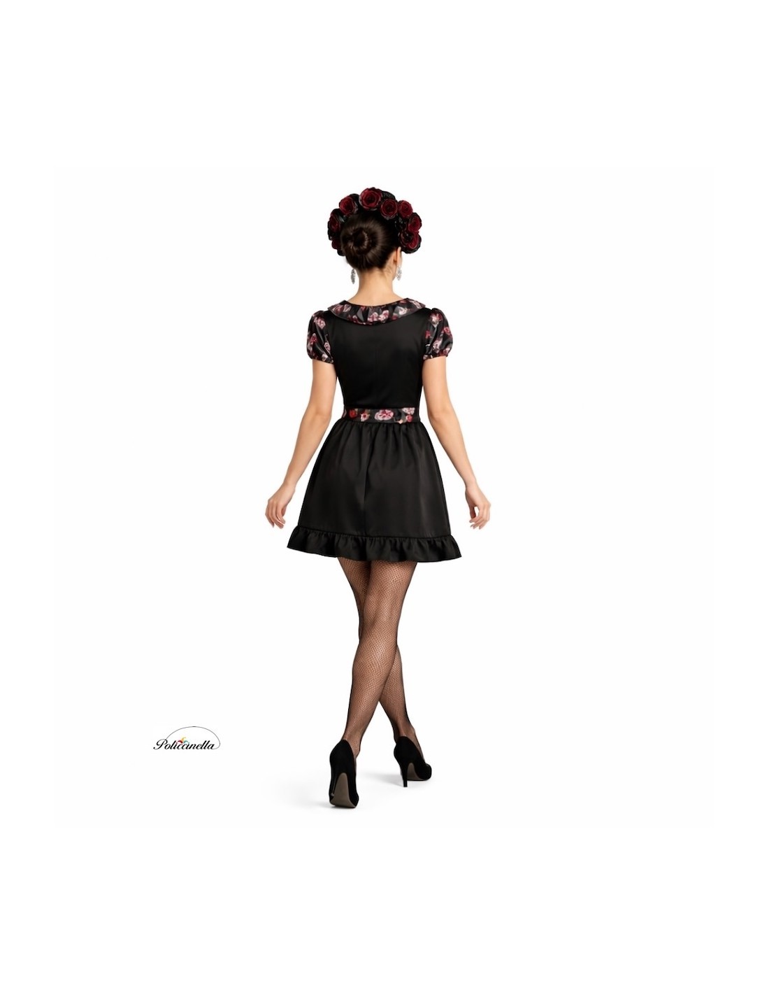 Elegant and original costume with a semi-elastic machine-knit bodice dress, decorated with painted bones (non-fluorescent). It has a velcro closure at the back of the neck for added comfort. The collar and sleeves are made of satin with a delicate floral and skull print, while the skirt is made of satin with a flared design and ruffle at the hem. The waist and sleeves have elastic for a perfect fit. The belt is made on a piece of TNT to provide body and structure to the garment. A light ensemble with carefully crafted details to dazzle with style and tradition.