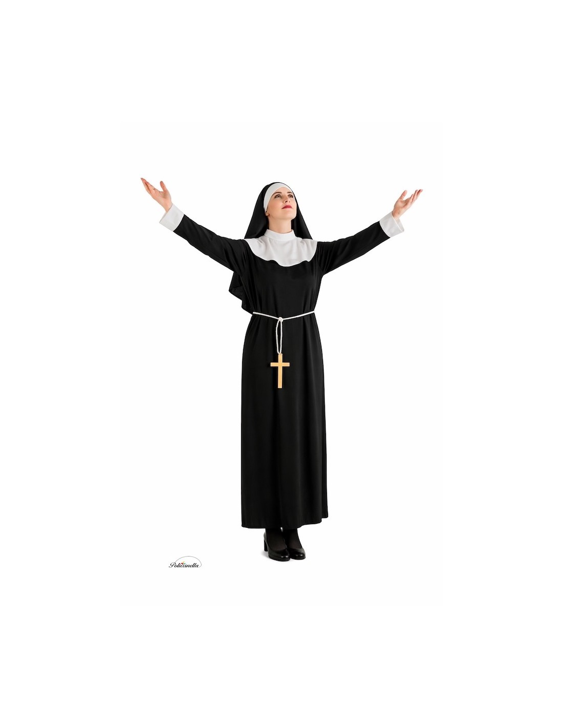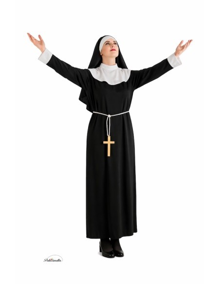 This versatile costume includes a tunic or hood made of soft, semi-elastic machine-knit fabric that offers great comfort and mobility. The garment is fastened with a velcro closure at the back of the neck, making it easy to put on. The cuffs, made of soft satin, provide a delicate contrast and an elegant finish. The white bib or headpiece, also in satin, closes with velcro for a perfect and comfortable fit. The cap combines knitted and satin fabrics, adjusting with velcro to fit the head without losing its shape. A polyester cord completes the ensemble, cinching the waist and adding a classic touch to the look.