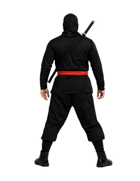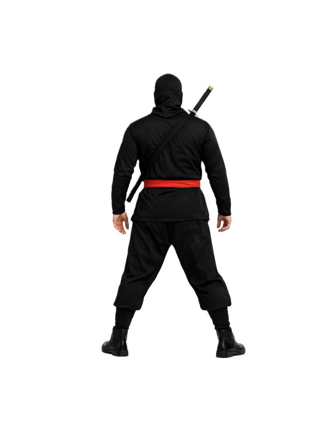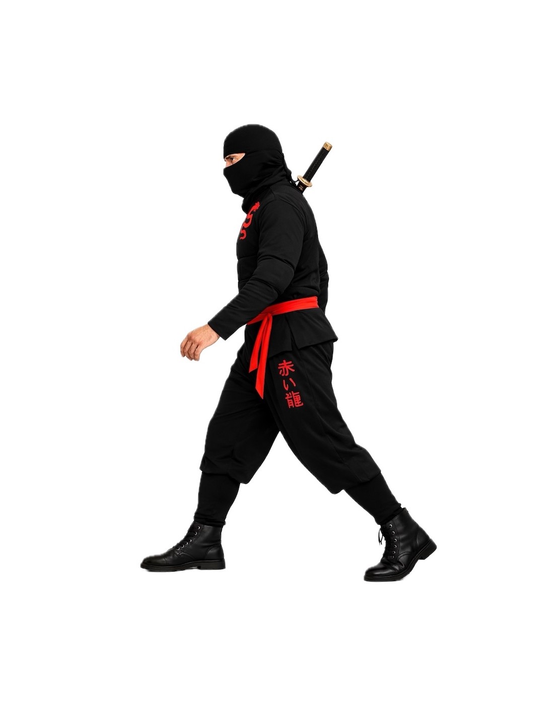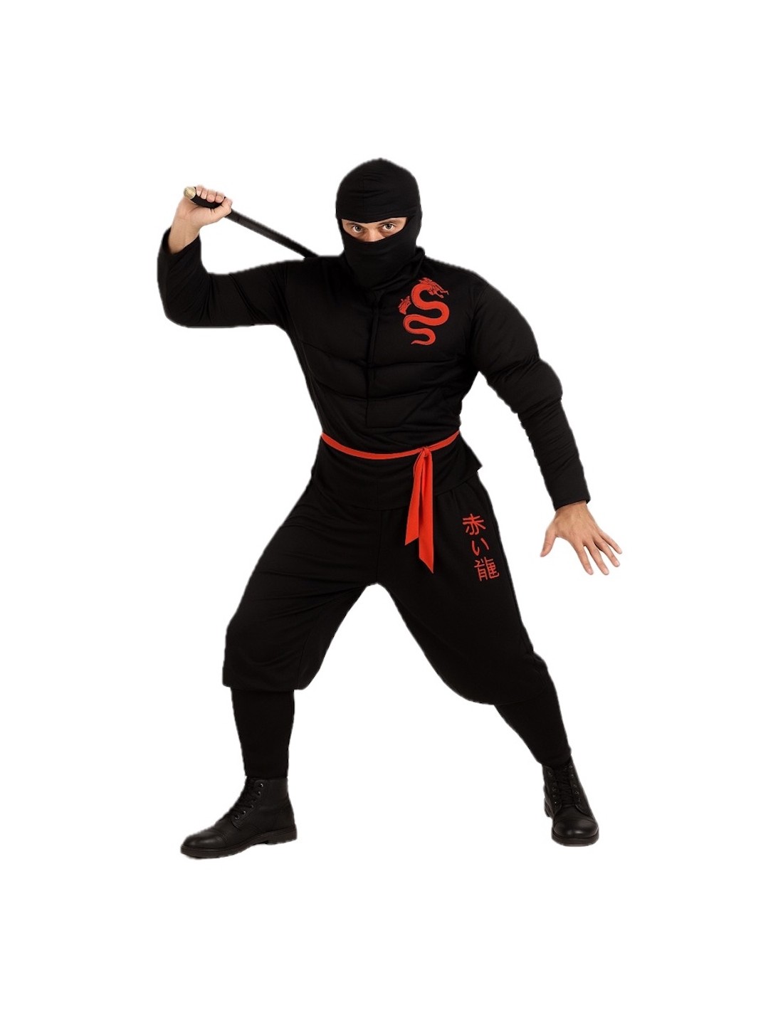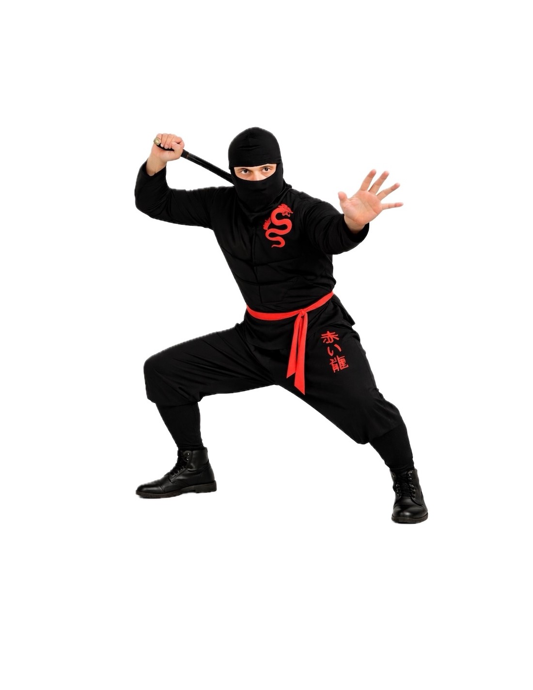 This complete and comfortable ninja costume is made of soft, semi-elastic machine-knit fabric, ideal for moving with agility. The shirt closes at the neck with Velcro and features padded areas on the arms and chest that simulate the character's musculature. On the front, a dragon printed directly on the fabric adds visual strength to the design. The matching pants, with an elastic waistband and interior pocket, include foam bottoms that securely cover the boot shafts. It is completed with a hood made of the same fabric, with a neck closure and a waistband to adjust the fit. Lightweight, durable, and high quality.