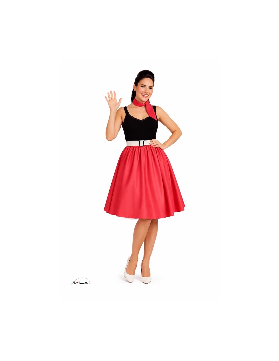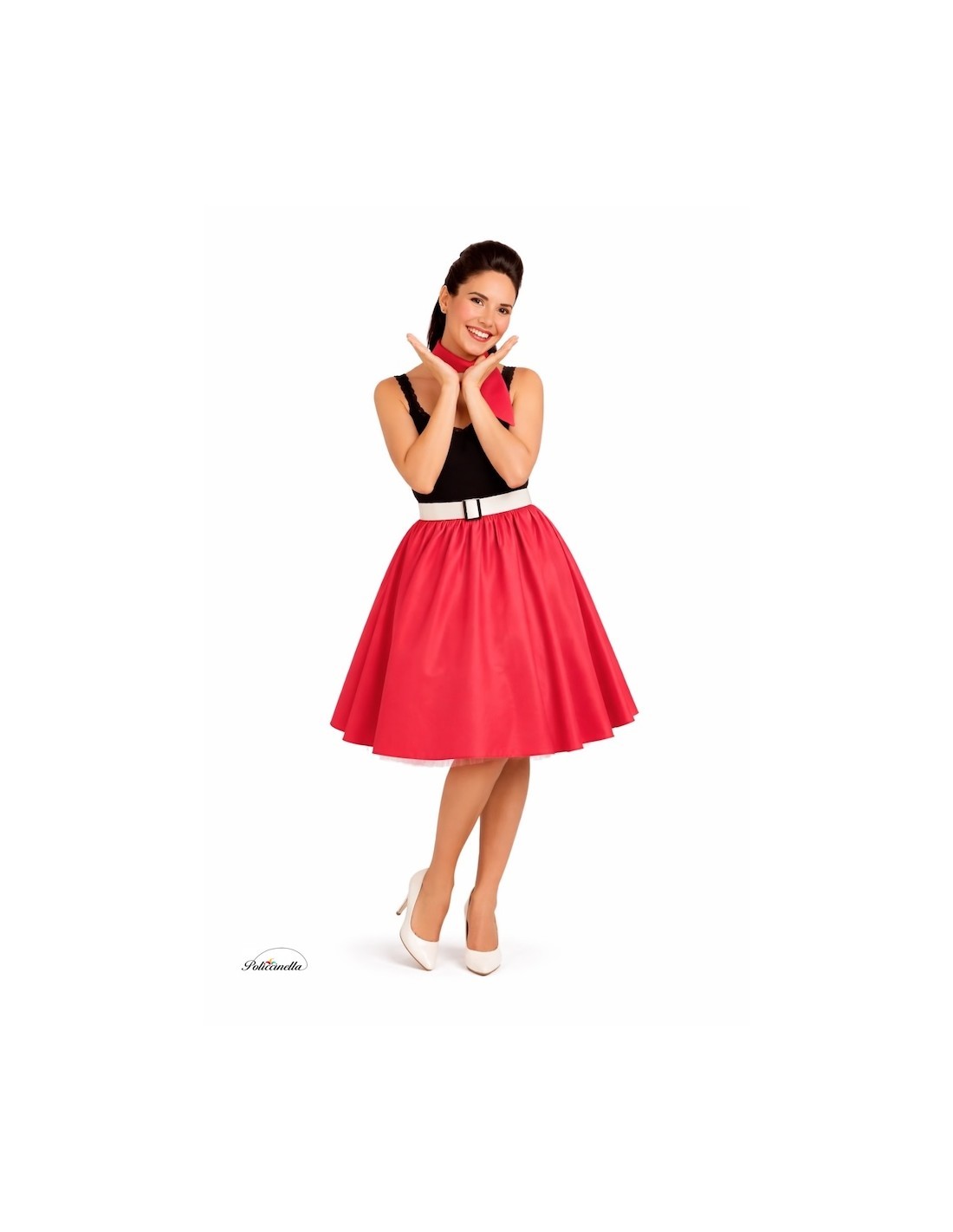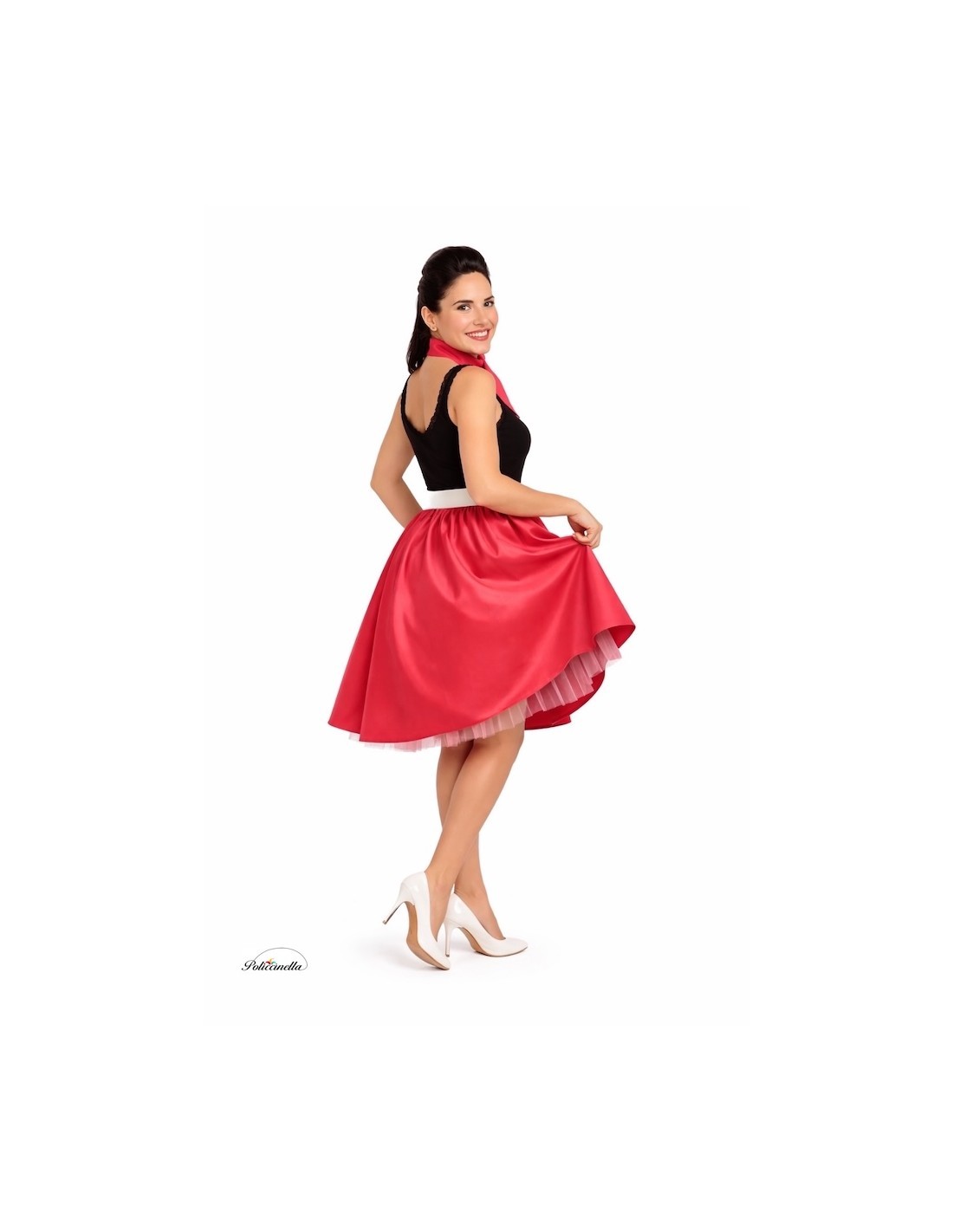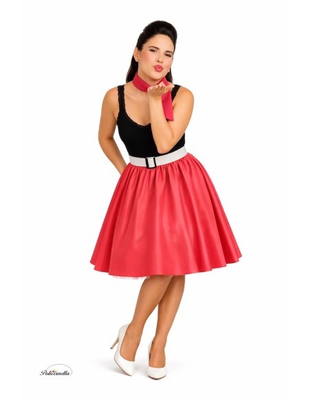 A classic and charming ensemble that pays homage to rockabilly style. The A-line skirt is made of soft and dense satin, with a gathered elastic waistband that adds volume, flare, and comfort. The hem is decorated with tulle that adds a flirty touch and movement when walking. It includes a rigid belt with a patent leather appearance, made of plastic on a TNT base to maintain its shape, and decorated with a metallic-effect plastic buckle; it fastens at the back with velcro. It is completed with a matching neck scarf, adding the perfect retro detail.