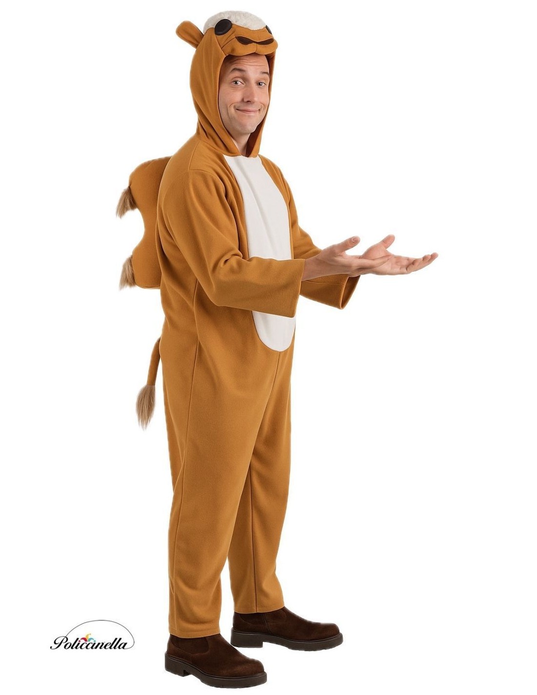 This camel costume stands out for its careful construction and the comfort of its design: Made of dense polyester fabric with a peach-like feel, featuring an invisible front zipper and an integrated hood for a practical and clean fit. The highlight of the costume is its hood with super soft faux fur and foam humps, which provide volume and an irresistible three-dimensional effect. Felt eyes and nose attached to the fabric complete the animal's character. A durable, warm, and lightweight costume!